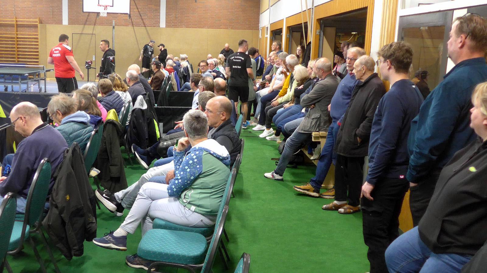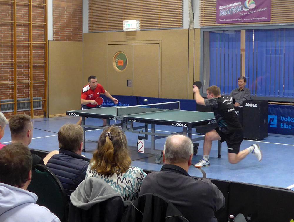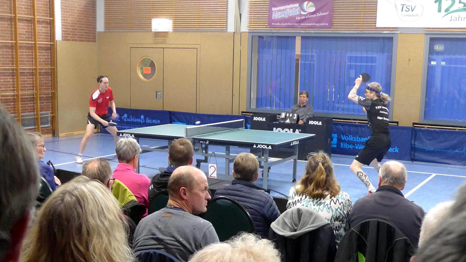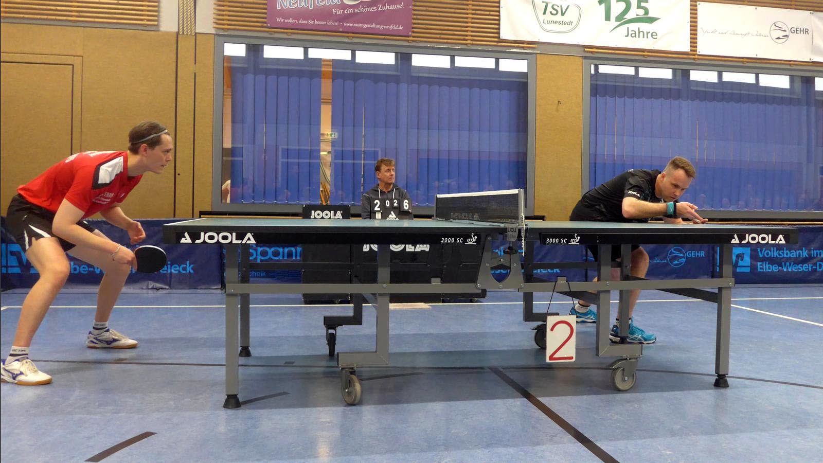 Oben legte Elger einen Start nach Maß hin und gewann fast 3-0. Doch der ukrainische Gefühlsspieler Asieiev spielte sich eindrucksvoll zurück. Im Fünften Elger aber wieder aktiver zur Lunestedter Führung. Als danach Martin nach bärenstarker Leistung gegen Cords mit vielen schönen Angriffsbällen gewann, zogen wir auf 3-1 davon. Es sah richtig gut aus und die Stimmung unter den etwa 130 Zuschauern hätte besser kaum sein können.