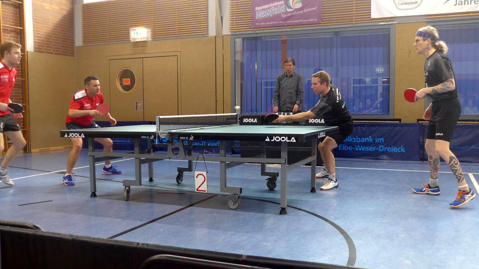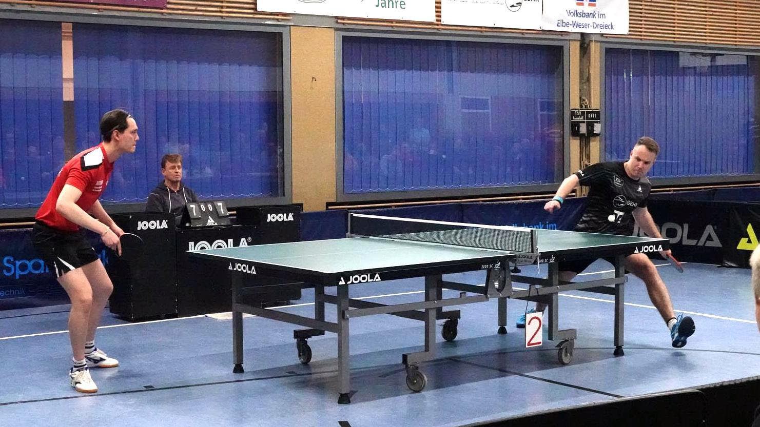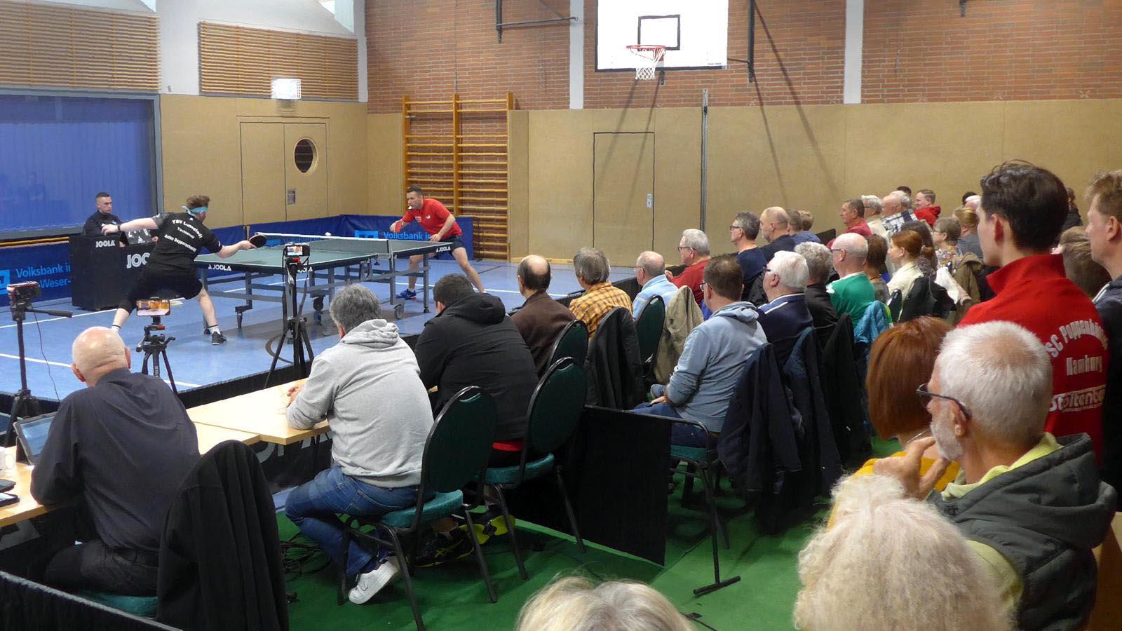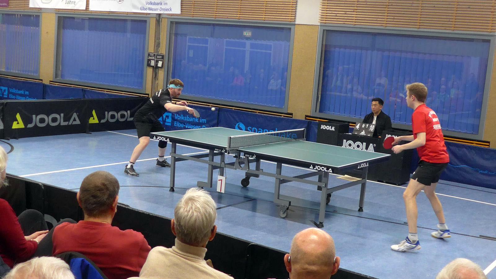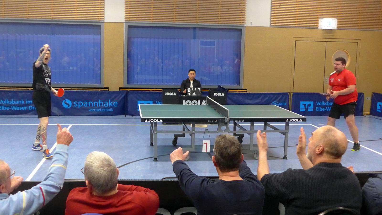 Oben legte Elger einen Start nach Maß hin und gewann fast 3-0. Doch der ukrainische Gefühlsspieler Asieiev spielte sich eindrucksvoll zurück. Im Fünften Elger aber wieder aktiver zur Lunestedter Führung. Als danach Martin nach bärenstarker Leistung gegen Cords mit vielen schönen Angriffsbällen gewann, zogen wir auf 3-1 davon. Es sah richtig gut aus und die Stimmung unter den etwa 130 Zuschauern hätte besser kaum sein können.