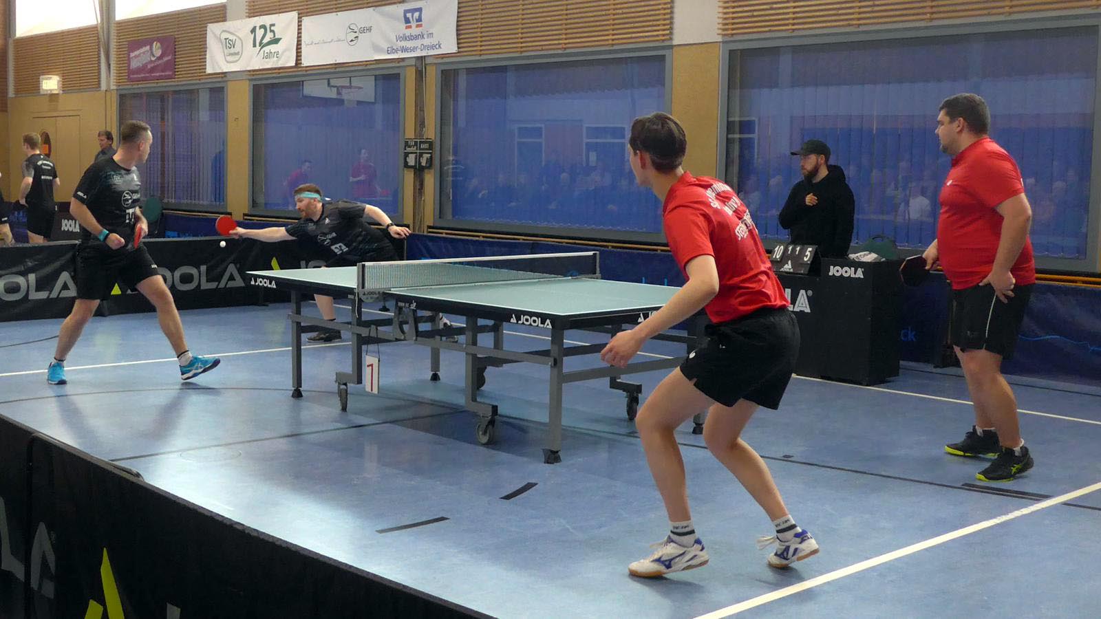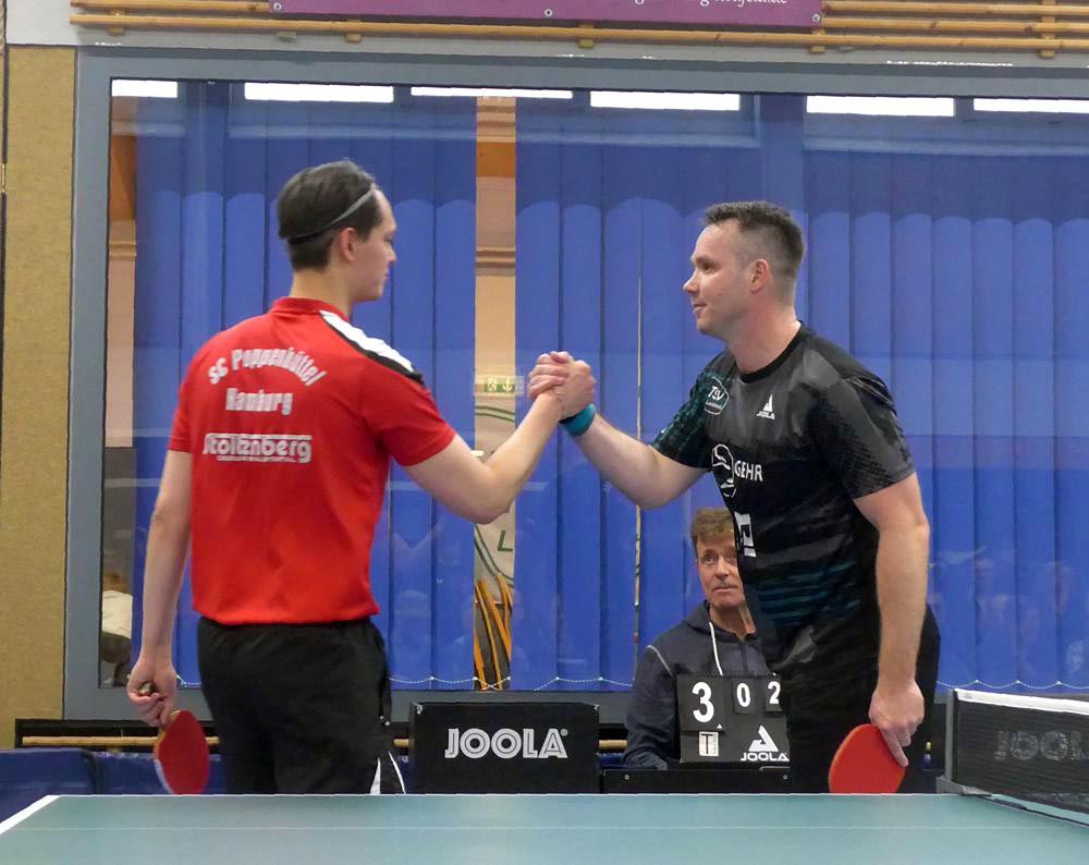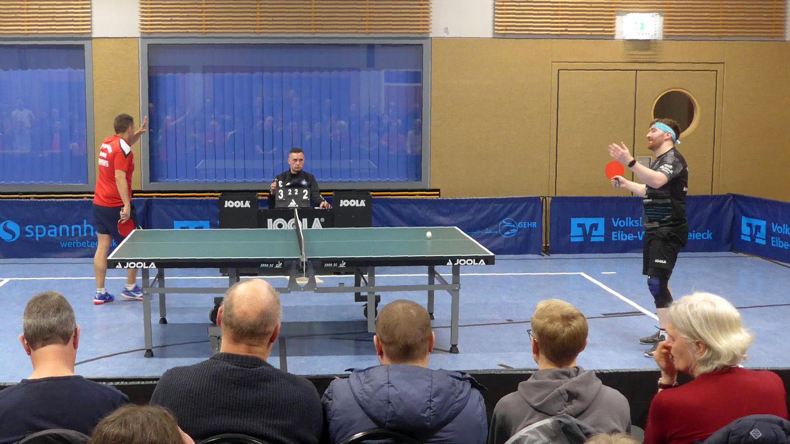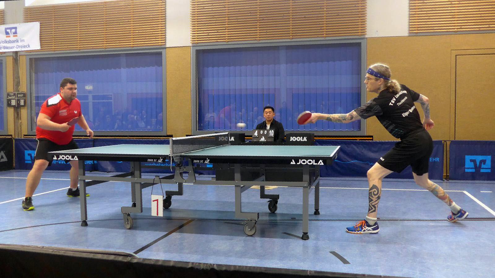 Oben legte Elger einen Start nach Maß hin und gewann fast 3-0. Doch der ukrainische Gefühlsspieler Asieiev spielte sich eindrucksvoll zurück. Im Fünften Elger aber wieder aktiver zur Lunestedter Führung. Als danach Martin nach bärenstarker Leistung gegen Cords mit vielen schönen Angriffsbällen gewann, zogen wir auf 3-1 davon. Es sah richtig gut aus und die Stimmung unter den etwa 130 Zuschauern hätte besser kaum sein können.