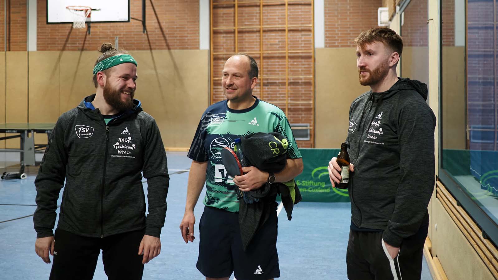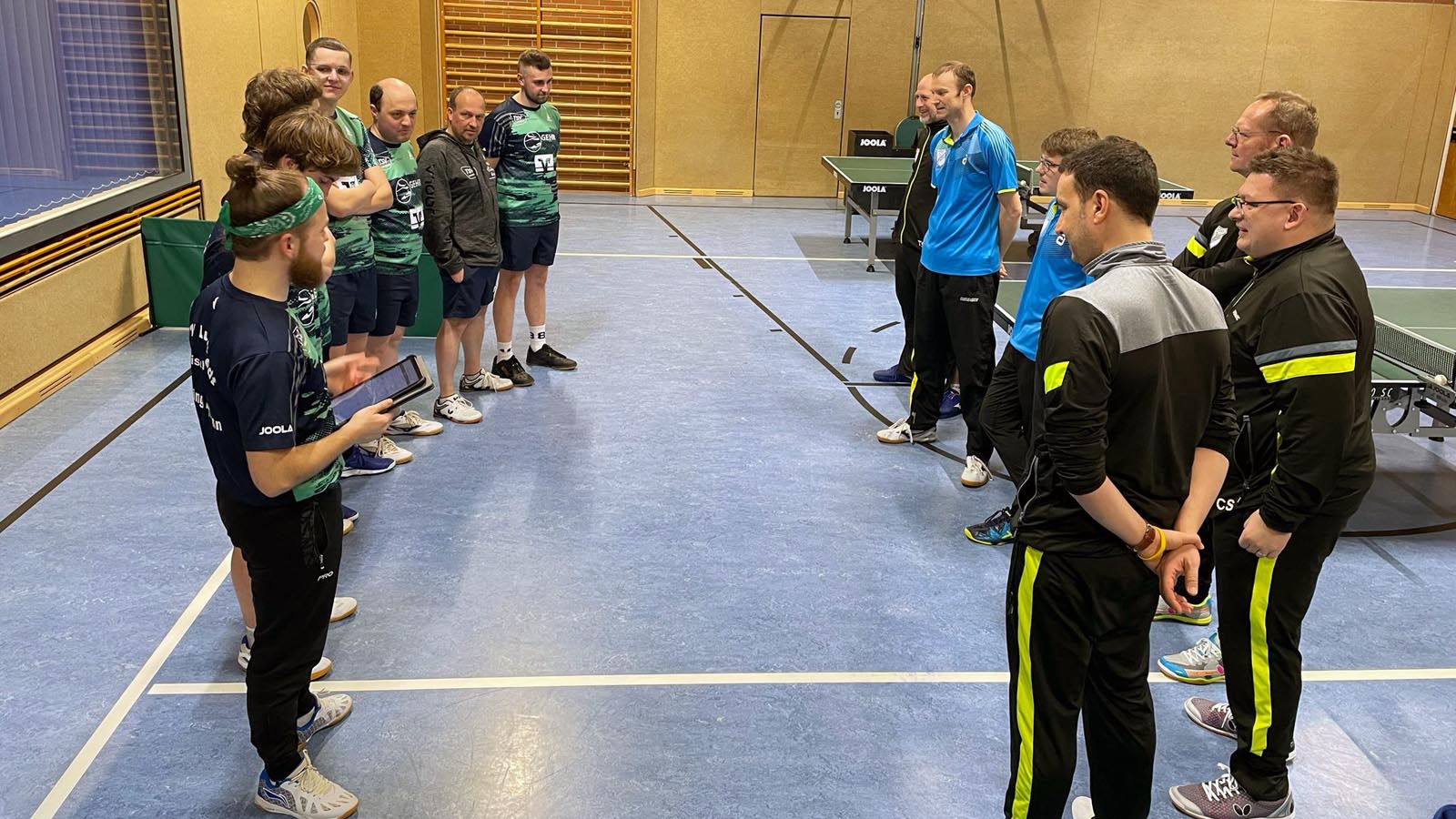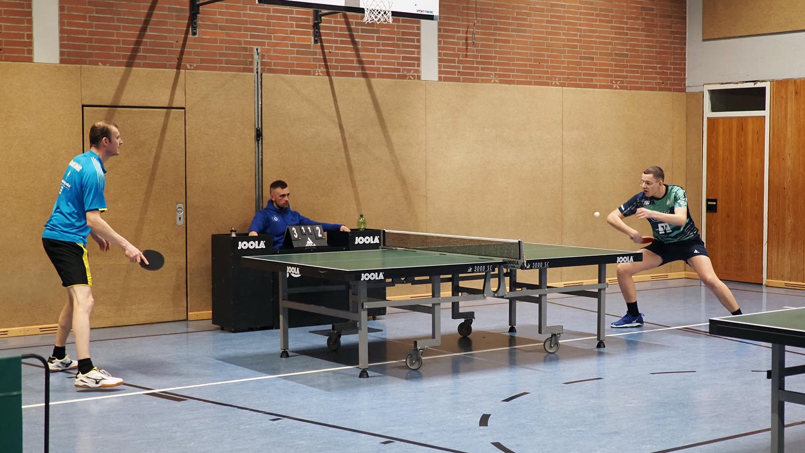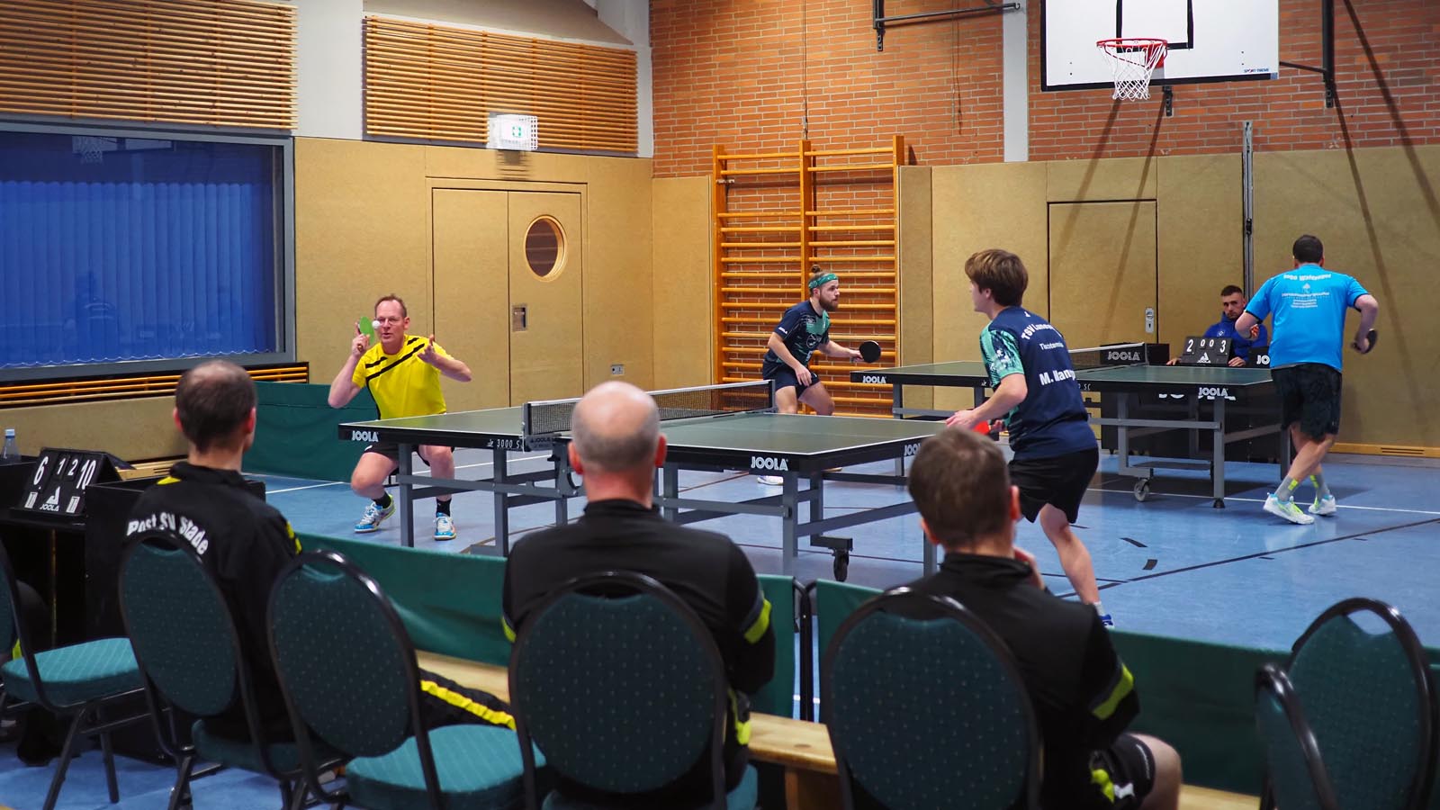Dass mit diesen jedoch zu rechnen ist, wurde bereits im Doppel klar, als Arne und Tiger gegen Burmester/Schwarz das Nachsehen hatten (1:3). Thorben und Edeljoker Luca hatten gegen das Einserdoppel der Gäste Kiekel/Steffens in der „Crunch-Time“ zu selten das Glück und den kühlen Kopf auf ihrer Seite, weshalb es hier ebenfalls ein 1:3 setzte. Loocki und ich starteten behäbig in die Partie gegen Waldvogel/Schmidt, rissen die Partie nach einem gemopsten ersten Satz jedoch zunehmend an uns und verhinderten den Fehlstart (3:0).