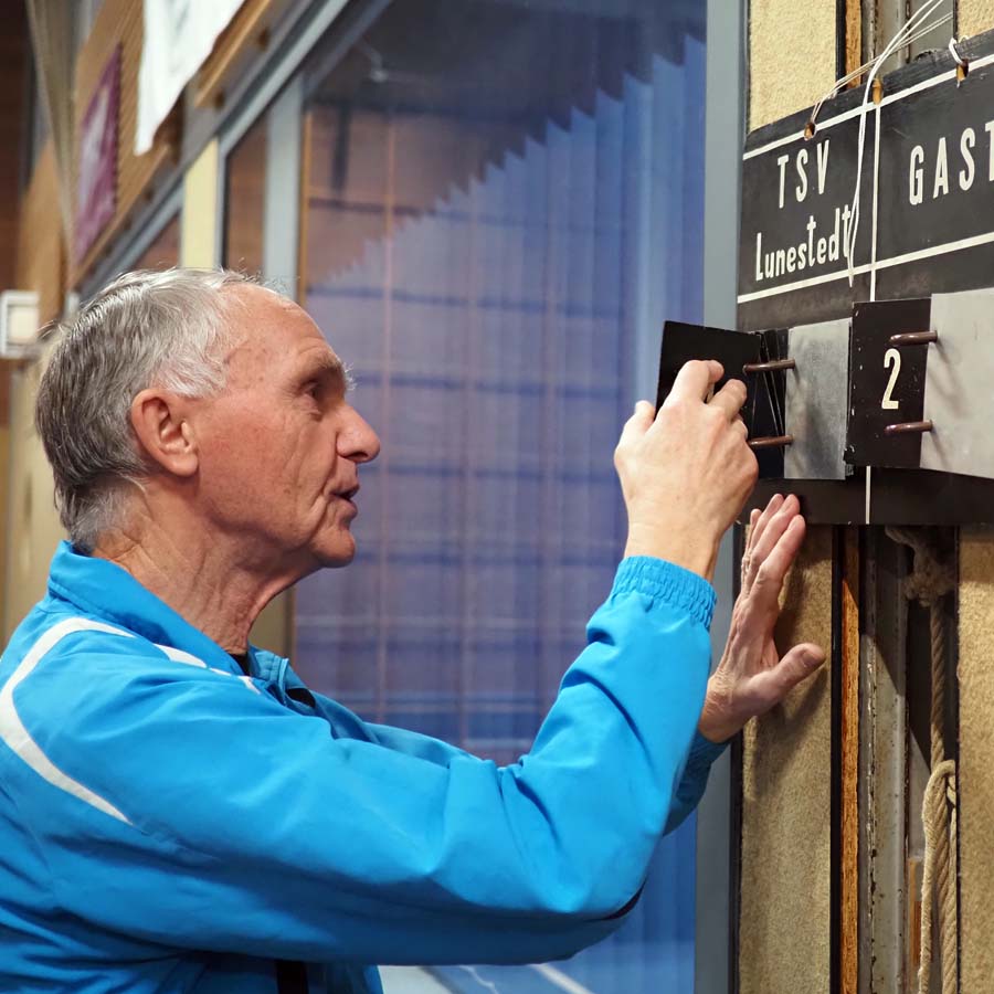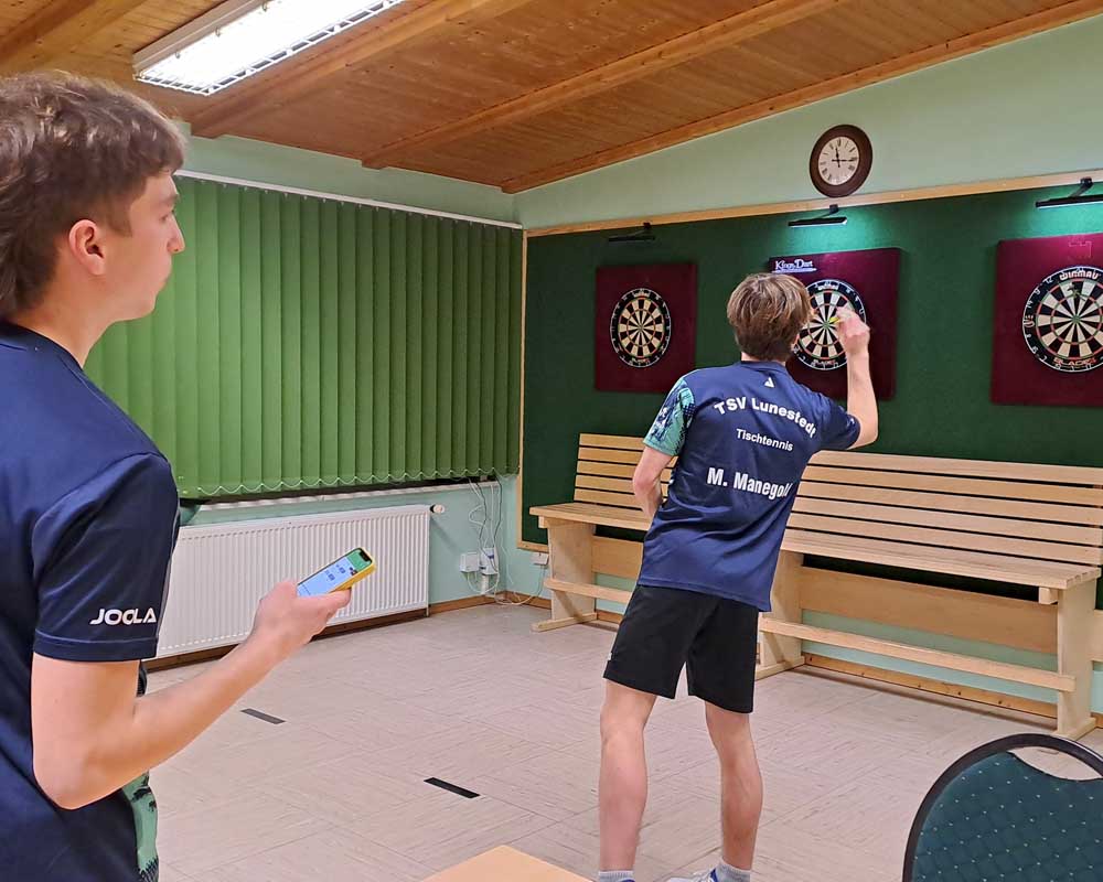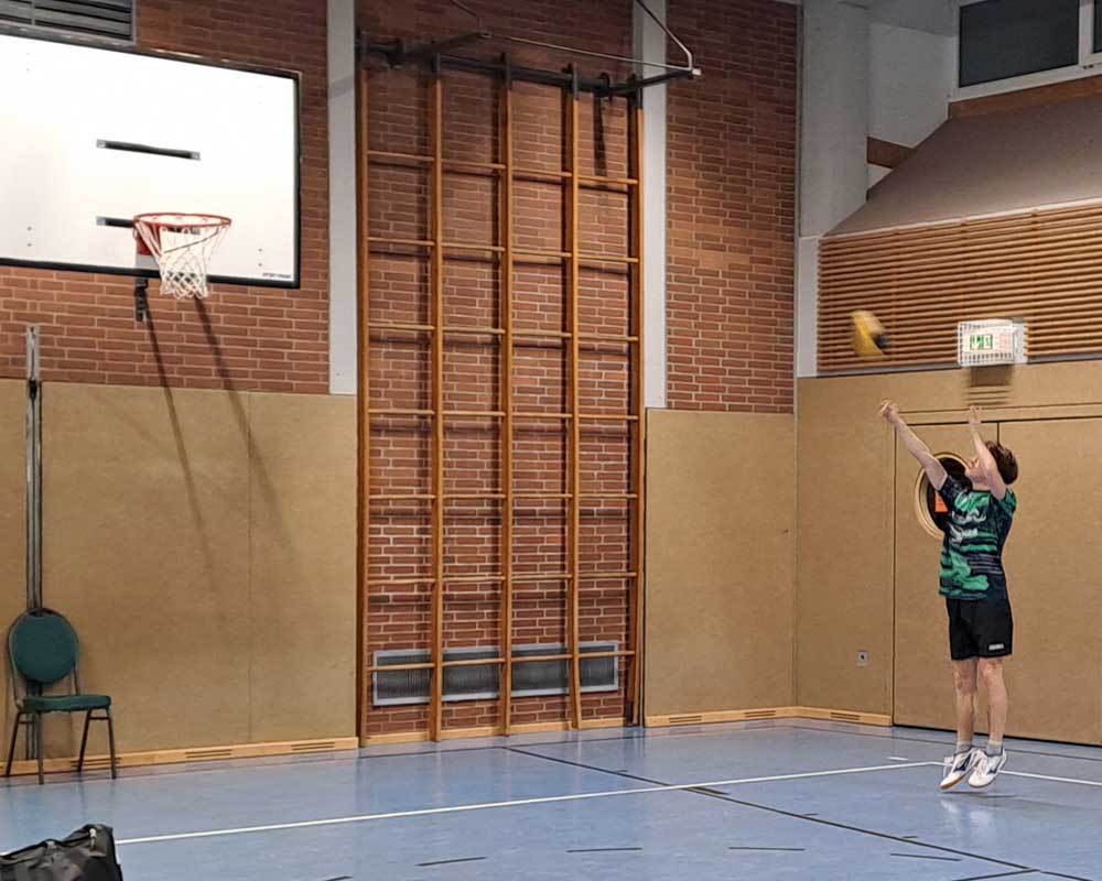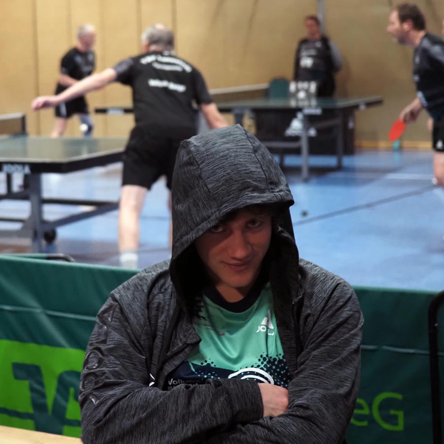 Unten schlug nun die Stunde von Edeljoker 2 Jungmediziner und Weltenbummler Mathis, der vor Beginn seines Spiels nicht nur einen komplett neuen Schläger in die Hand nahm, sondern aufgrund seiner Abwesenheit im Doppel auf einen Zwischenstand von 7:1 bestand. Wer Mathis kennt, weiß, dass dessen Leistungen nach längerer Trainingspause durchaus schwanken können. Dies wurde auch dadurch bekräftigt, dass sein Gegenüber Burmester seinen Bällen beim Einspielen nicht näher spezifizierbare Flugeigenschaften zusprach. Es kam, wie es kommen musste, Mathis holte aus, traf den Ball im ersten Satz nur ein paar Mal und wenn er sie traf, flogen sie gefühlt zum Helgoländer Fähranlieger. Ich verließ die Halle, um mich aufzuwärmen und auf mein anstehendes Spiel vorzubereiten. Gefühlte 5 Minuten später war die Messe gelesen und Mathis hatte ein 3:1 auf der Habenseite. Für nähere Einzelheiten erbitte ich persönliche Anfragen bei Sportsfreund Manegold.