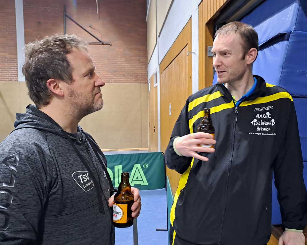 Im oberen Paarkreuz knüpften Loocki und ich überdies an unsere jüngsten Leistungen für die Zweite an und zeigten gegen Waldvogel (3:0 Loocki) und Kiekel (3:1 für mich) jeweils überzeugende Partien. Thorben sah sich gegen Schmidt abermals seinem eigenen Spiel zwischen Genie und Wahnsinn ausgesetzt, verhinderte im 4. Satz nach 9:1 Führung jedoch Schlimmeres, in dem er den Satz mit 11:9 an Land zog (3:1). Arne und Tiger lieferten sich beim Zwischenstand von 4:2 aus unserer Sicht jeweils haarsträubende Partien gegen Steffens und Schwarz. Mit ihren unterschiedlichen Lösungsansätzen aus in sich gekehrter Ruhe und kanalisierter Wut vermochten sie jedoch beide ihre Partien zu gewinnen und uns mit dem resultierenden Zwischenstand von 6:2 auf die Siegergeraden zu leiten.
