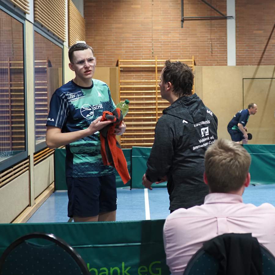 - Thorben bewies im oberen Paarkreuz, wieso wir ihn zur RR dort aufgestellt haben, indem er Pump beim 2:3 die Stirn bot und etwaigen mentalen Durchhängern in den wichtigen Momenten im Spiel gegen Gerdes nicht die Oberhand gewinnen ließ (1:1).