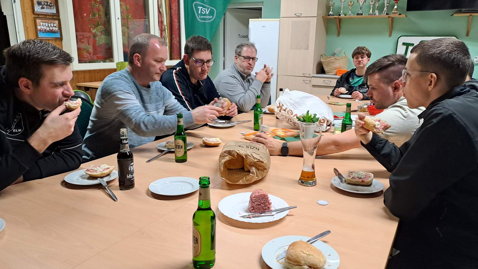 - Pumpi bevorzugt nach wie vor eine große Menge Zwiebeln auf seinem Mettbrötchen, während er beim netten Zusammensein der beiden Teams alte Bilder seiner selbst auf Lunestedter „Klatschhilfen“ wiederfindet.