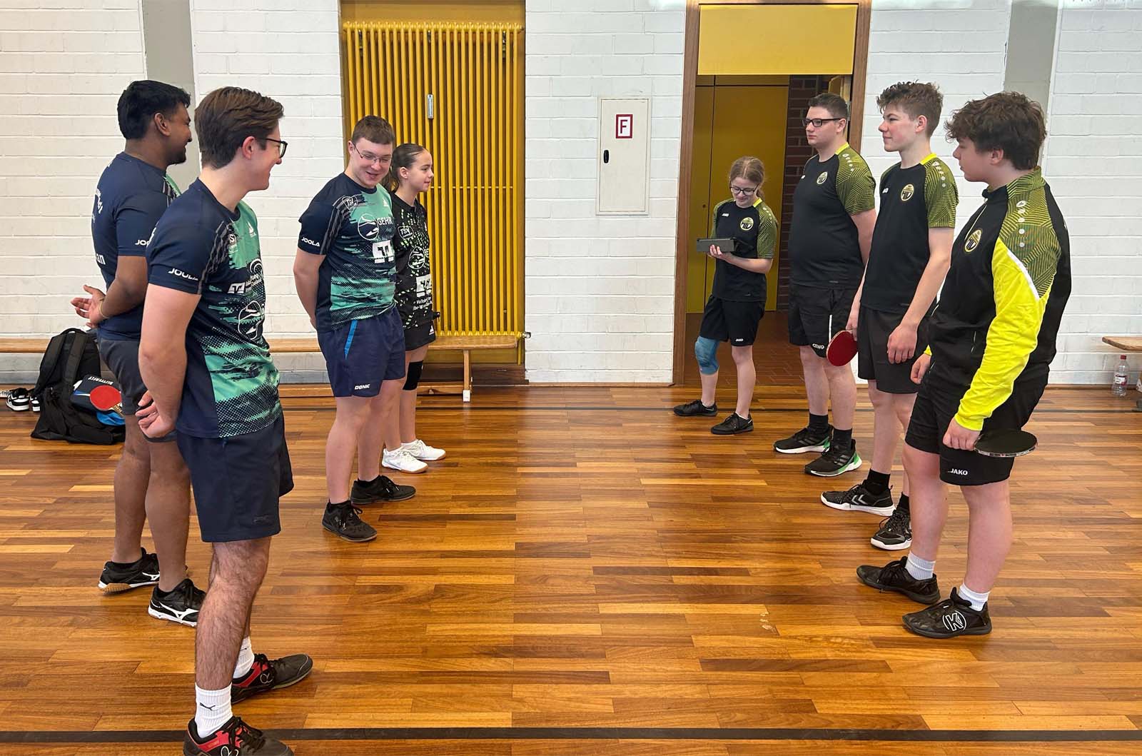 Das Doppel bestehend aus Jona und Elisa verlor nach starker Aufholjagd von 0:2 zu 2:2 in Satz 5 mit 4:11 gegen einen starken Sebastian Hennig und Anna Lena Alpers. Abbi und und ich gestalteten unser Doppel nicht weniger spannend, jedoch gelang uns nach einem mental zermürbendem 5. Satz doch noch der Sieg von 14:12.