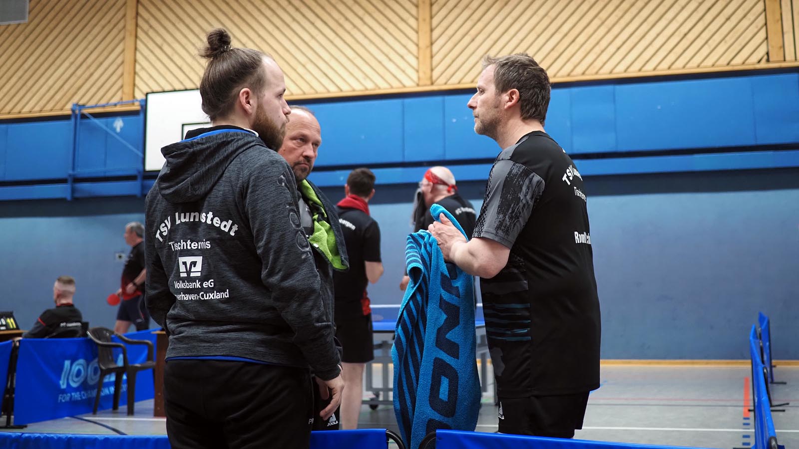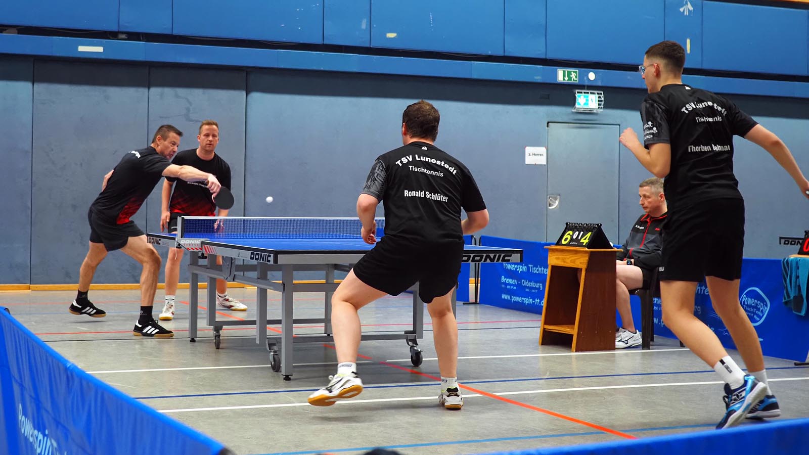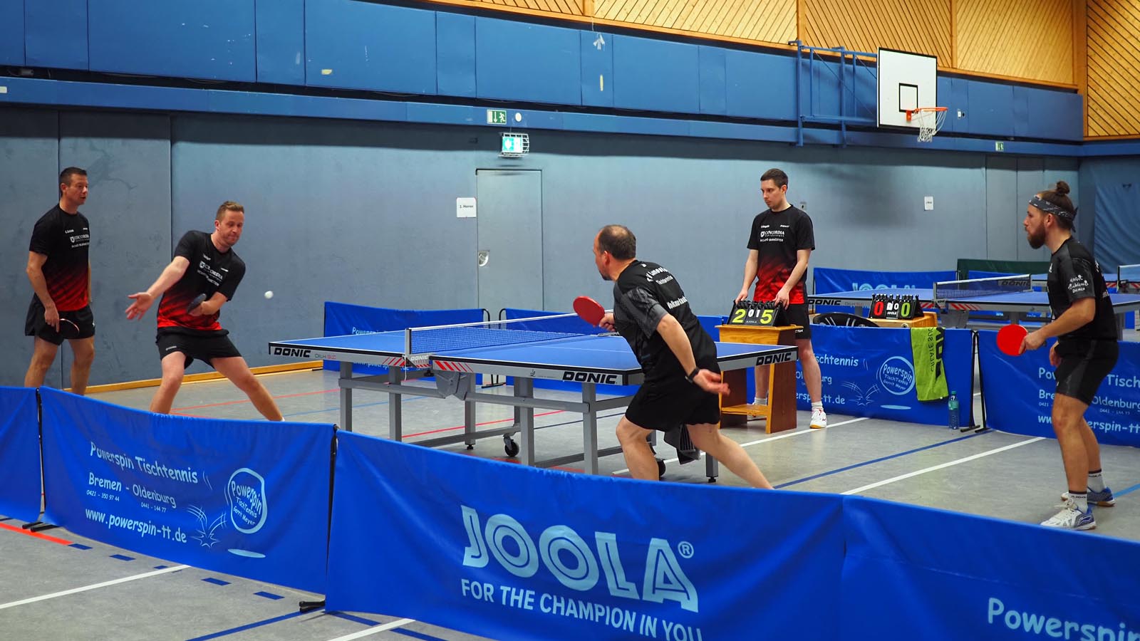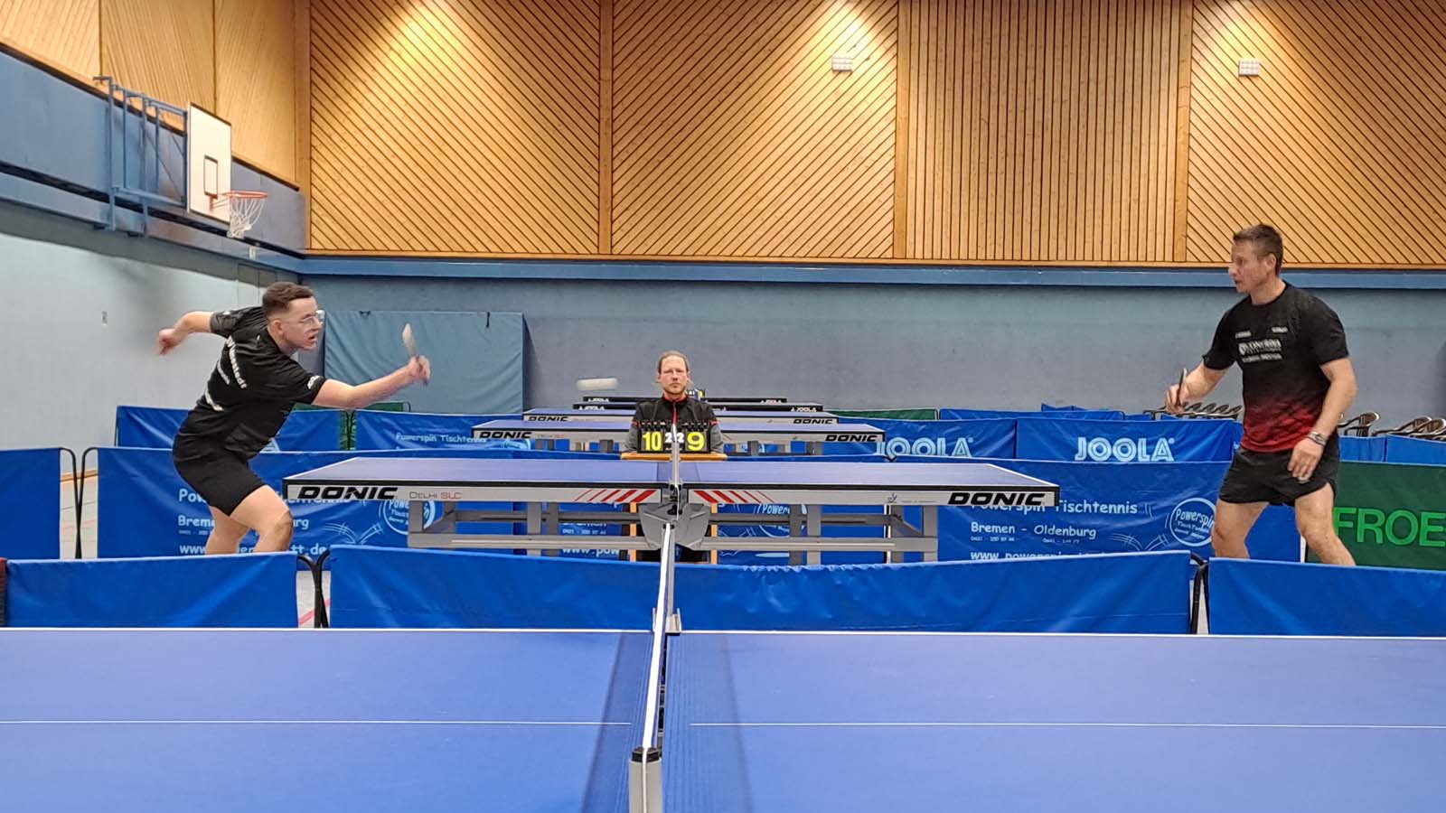 In der ersten Einzelrunde musste sich Thorben einem stark aufspielenden Mogalle geschlagen geben, welchen er in der Hinrunde im unteren PK der Verbandsliga noch geschlagen hatte (1:3). Ich zeigte im Anschluss einmal mehr, dass ich nicht der Blindeste gegen Material bin und hielt Schledes Stör-/Schussspiel in Schach (3:0). Auf ähnliche Art und Weise unterstrich Arne gegen Grotjohann, dass in Fünfsatzspielen mit ihm zu rechnen ist und er wie so oft noch einen Trumpf aus seinem imaginären Zauberhut ziehen kann (3:2 nach 0:2). Tiger ließ gegen Krüger erkennen, dass er häufiger mit (einem) Linkshänder(n) trainiert und ließ beim 3:0 wenig anbrennen. Ronald hingegen tat sich gegen die kurze Noppe von Jahic schwer und blieb beim 0:3 in jedem Satz ein wenig unter seinen spielerischen Möglichkeiten. Rü zeigte sich unter aufgeregtem Blick von Sohnemann Uwe mal wieder in bester Lauflaune und bewältigte gegen Kück gefühlt die ersten 10 km im Abwehrgang. Leider war bis auf einen Satzgewinn noch kein Zieleinlauf in Sicht, weshalb es beim 1:3 bleiben sollte.