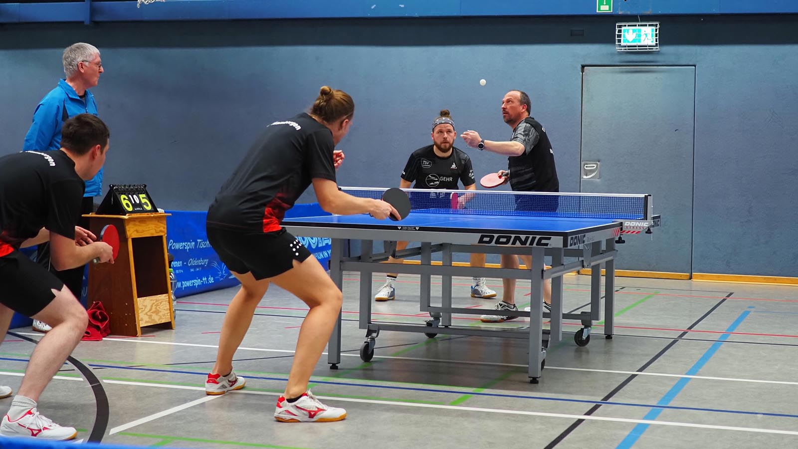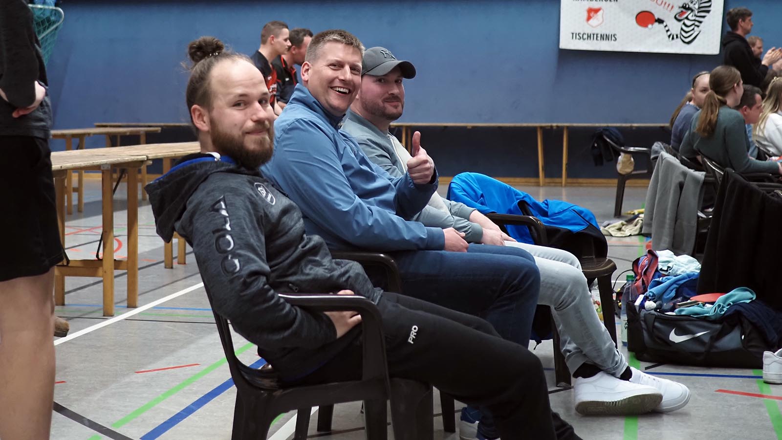 In den Doppeln landeten Thorben und Ronald gegen das Einserdoppel der Gegner den großen Wurf, indem sie Störspieler Schlede und Linkspfote Krüger mit einem 3:1 in Schach hielten. Parallel bekamen es Tiger und ich mit Mogalle und Kück zu tun. Während Ersterer zu Beginn den Eindruck erweckte, vielleicht im Parallelspiel an den Tisch zu gehen, überraschte uns vor allem Kück mit einigen unorthodoxen, wenngleich sehr effektiven Spins und Platzierungen. Um die zoologischen Anspielungen mal wieder auf den Tisch zu bringen, spielten Tiger und ich ganz im Stile eines Tigerhais. Wochenlang ohne Nahrung auskommend, aber wenn dann mal potenzielle Beute in Aussicht ist (darunter auch Autoreifen, Bierflaschen und ja, leider manchmal auch Menschen) wird zugeschlagen. So mopsten wir uns nach einem 6:10 im zweiten Satz tatsächlich auch die folgenden zwei Durchgänge, obwohl wir jedes Mal 3-4 Punkte zurücklagen, jedoch in den engen Situationen immer das nötige Quäntchen mehr „Biss“ (bei der Tierauswahl auch keine andere Option!) hatten. Arne und Rüdiger unterlagen nach zwischenzeitiger 2:1-Führung gegen die Links-Rechts-Kombi Grotjohann/Jahic.