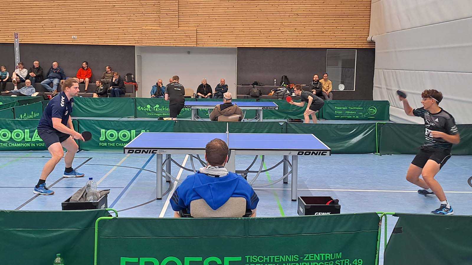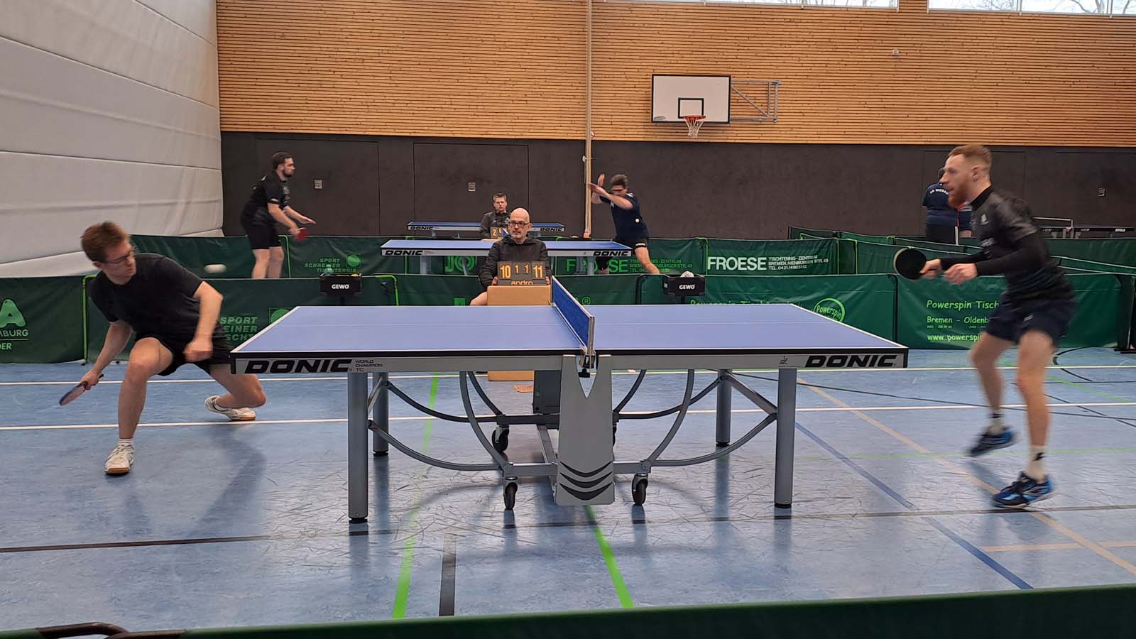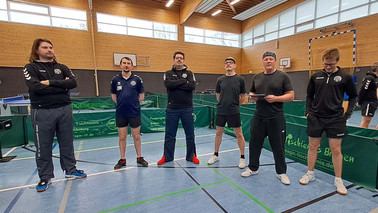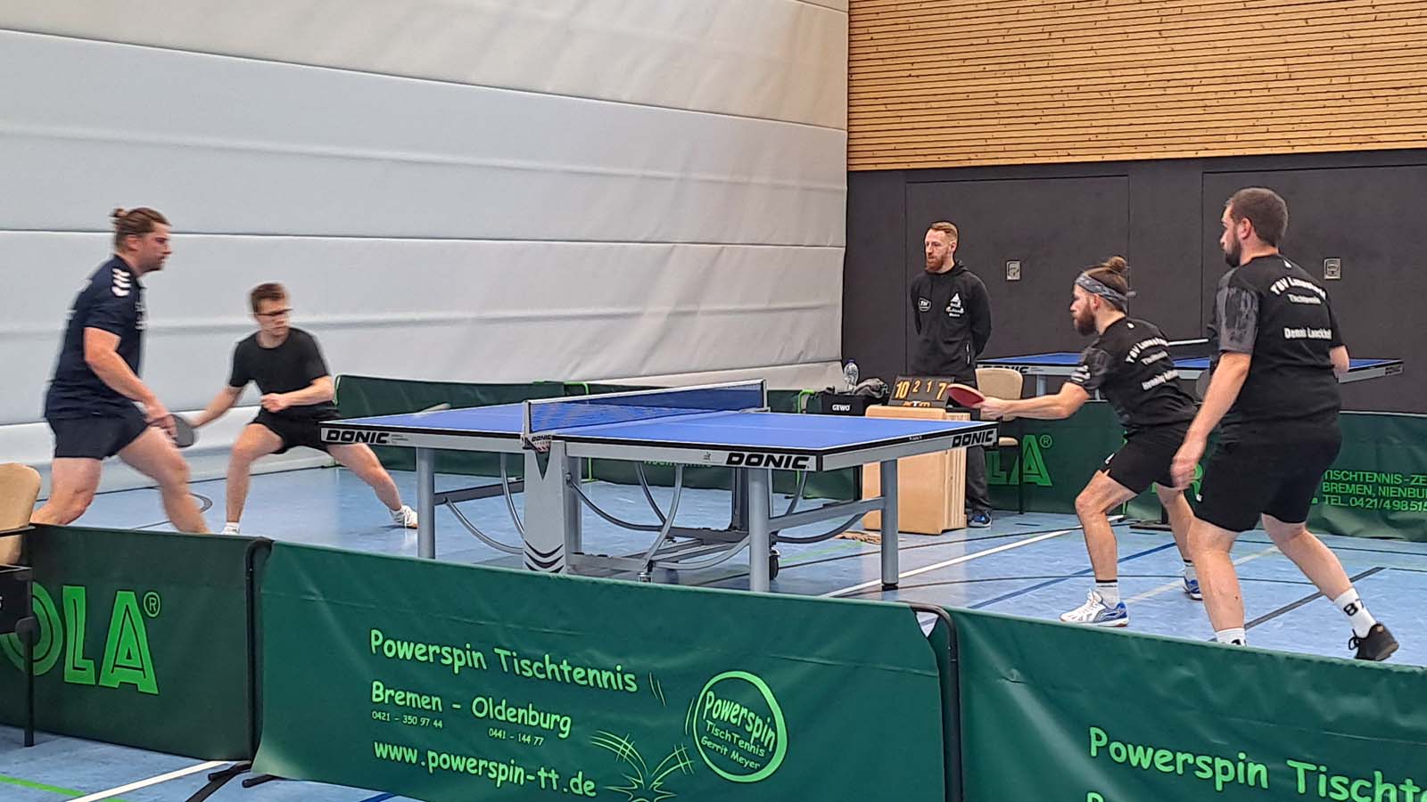 Hatte Arne bei seinem letzten Einsatz gegen Hambergen noch seinen ersten Einzelerfolg in der Verbandsliga verbucht, zog er an diesem Tag an Uwes Seite auf Anhieb nach und markierte gegen das Einserdoppel der Gastgeber Walle/Schwiering seinen ersten Doppelerfolg (3:1) (Anm. d. Red.: müsste der Zweite gewesen sein). Loocki und insbesondere ich waren hingegen weit von unserer Leistung aus dem Entscheidungsdoppel des Vortags entfernt und hatten somit das Nachsehen gegen Voß/Heimbrock (1:3). Peter und Thorben fanden gegen Schweneker/Igel so gar nicht in die Partie und verloren in der Folge mit 0:3.