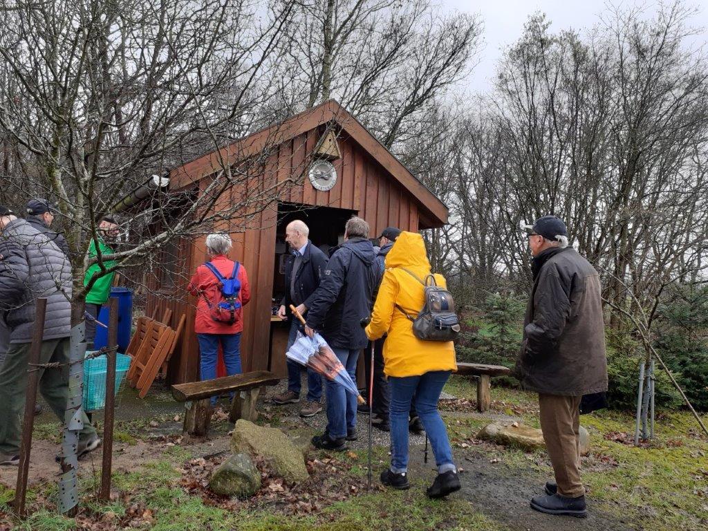 19 Wanderer/Innen waren fest entschlossen, dem Regen und Sturmböen die Stirn zu bieten und wanderten immerhin eine kurze Strecke direkt zum Stockentenhaus. Diese Hartgesottenen sollten natürlich nicht auf den Glühwein verzichten. So haben wir einen Teil des Glühweins zügig zum Stockentenhaus gebracht. Annemarie Holscher hatte wieder einmal für kleine süße Leckereien gesorgt.