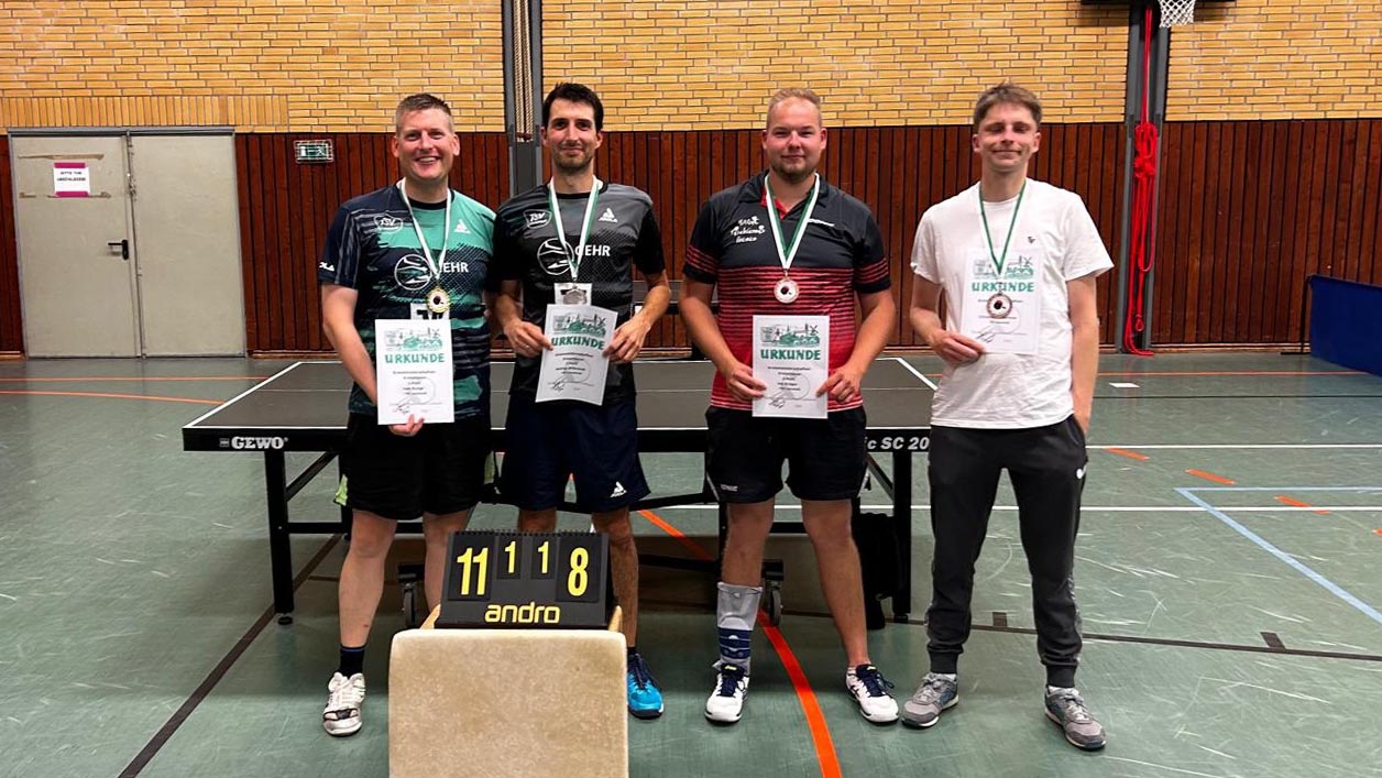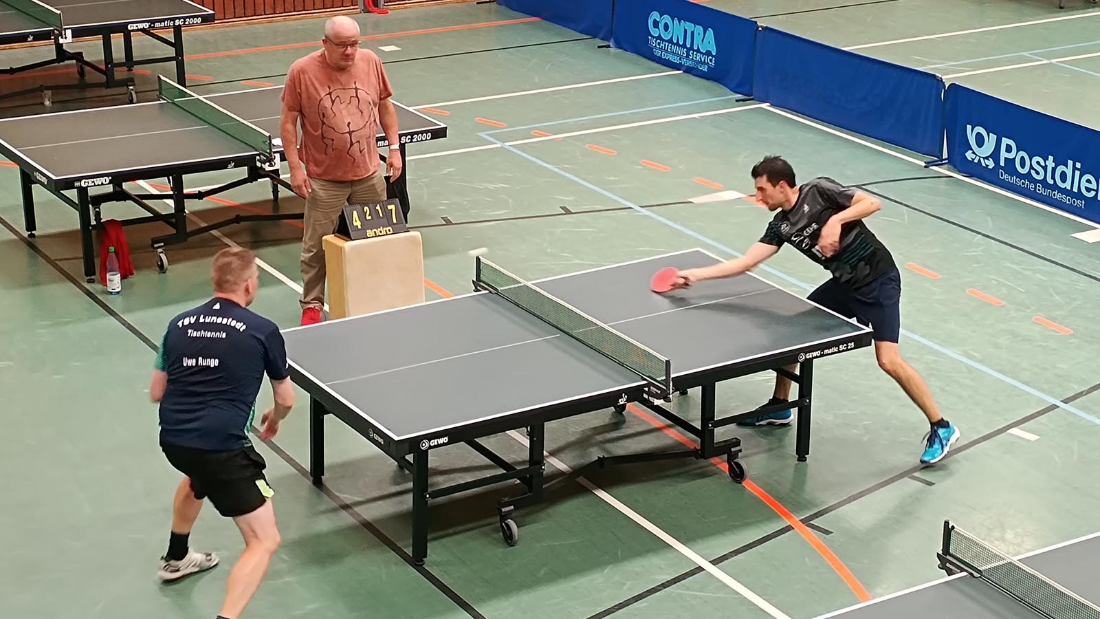 Vier Teilnehmer aus Lunestedt mit Thorben, Volkmar, Mattias und Uwe und nach einigen Jahren der Abstinenz endlich wieder einige Lunestedter auf dem Siegertreppchen. In den Gruppenspielen konnten sich alle vier schadlos halten gegen die Gegner aus verschiedenen Vereinen. Einzig im vereinsinternen Duell musste Tiger sich Matze geschlagen geben. Etwas überraschend dann die deutlichen Dreisatzniederlagen im Viertelfinale von Tiger gegen Kai Krüger und Thorben gegen ex-Lunestedter Christian Völschow. Im Halbfinale wurden Matze(3-2 nach 0-2 Rückstand) und Uwe(3-0) ihrer Favoritenrolle gerecht. Das ansehnliche Finale um 1.00 Uhr morgens gewann Uwe dann in vier Sätzen.