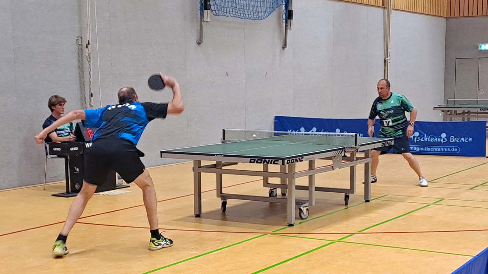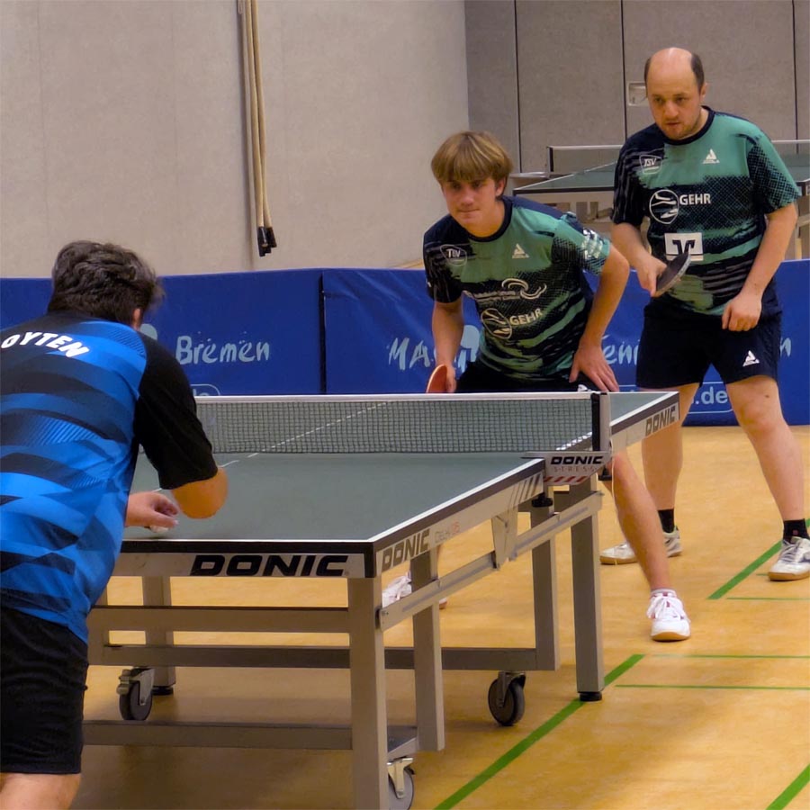 Unsere Doppel blieben mangels Alternativen weitestgehend unangetastet. Alle drei Paarungen waren konkurrenzfähig, aber alle drei Paarungen verloren. Am ehesten wäre Rüdiger/Ronald in Doppel 3 der Erfolg gelungen. Möglicherweise war Ronald aber auch zu verunsichert, weil er von Uwe und mir kurz vor Beginn erfuhr, dass er sowohl der Jüngste als auch der einzige Angreifer bzw. Materiallose am Tisch ist.
