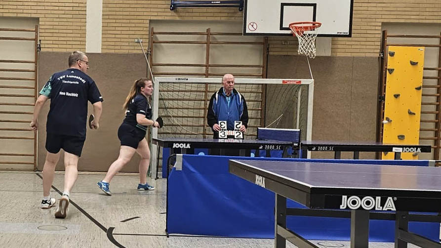 Dann ging es in die Einzel und noch bevor der erste Ball gezählt wurde, hörte man das erste “Time” in der Halle. Die langjährige Zählerin unserer ersten und selbst für den ESC noch aktive Karin Flemke beendet das Einspielen von Maiko und Johanna, und noch bevor das Spiel endet, trotz langem Einspielen und Timeout, geht Johanna als Siegerin aus dem Spiel.