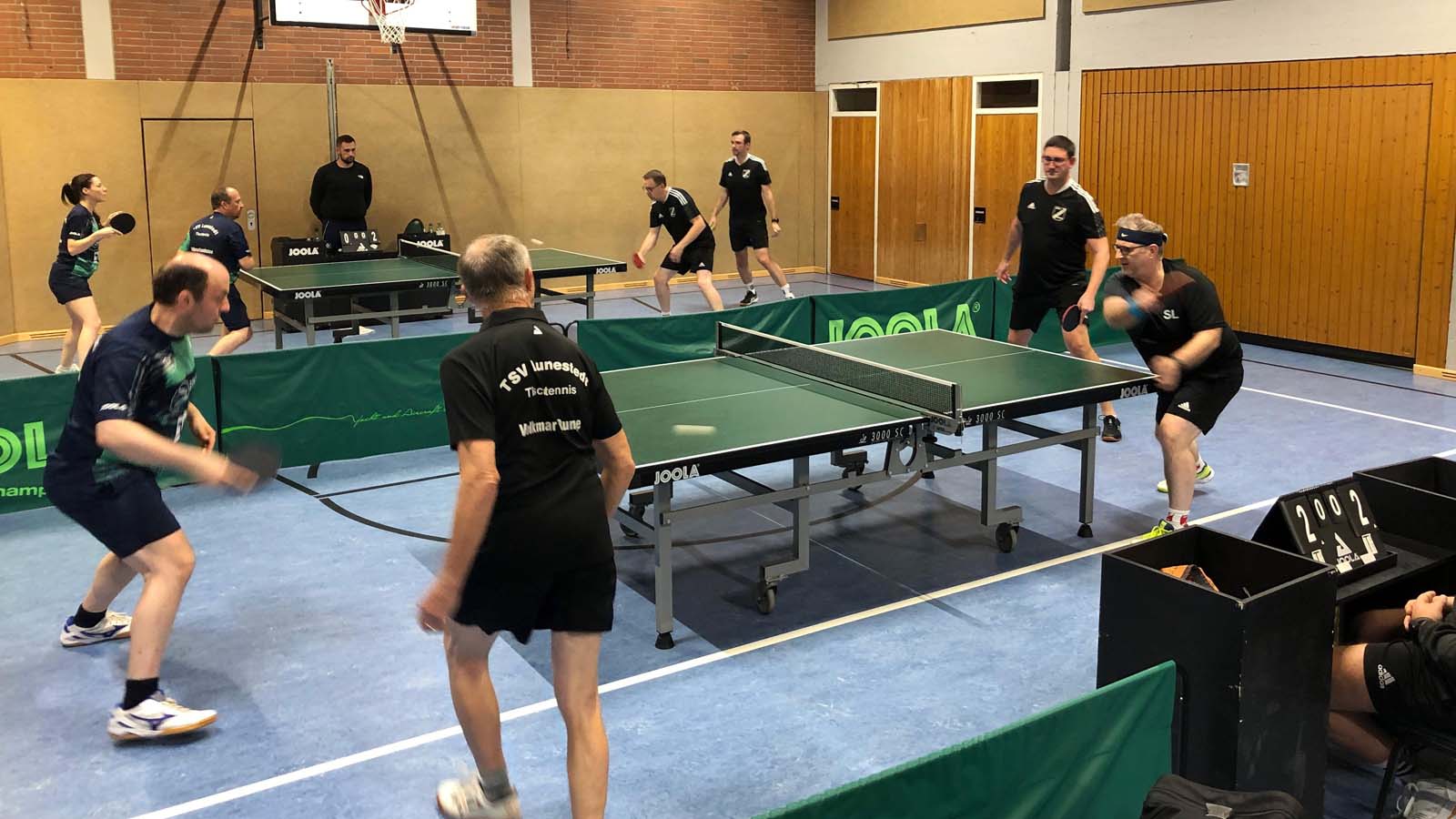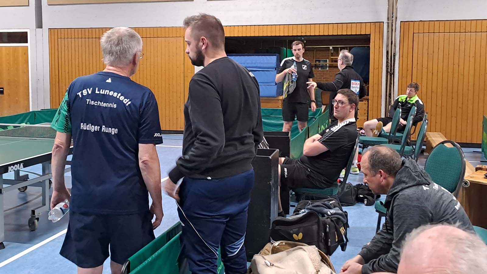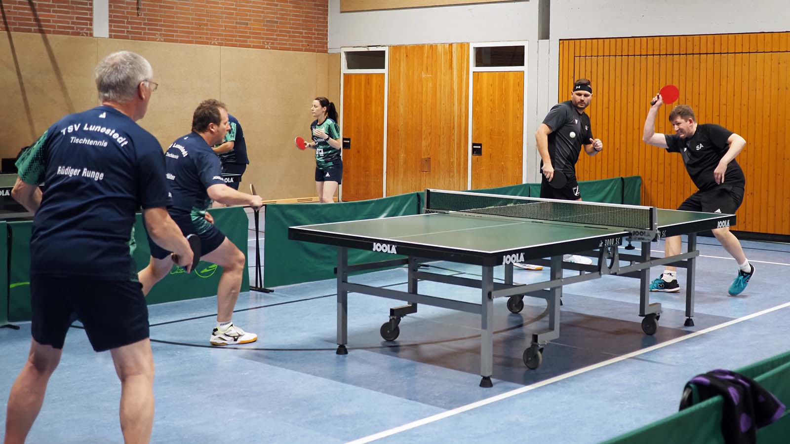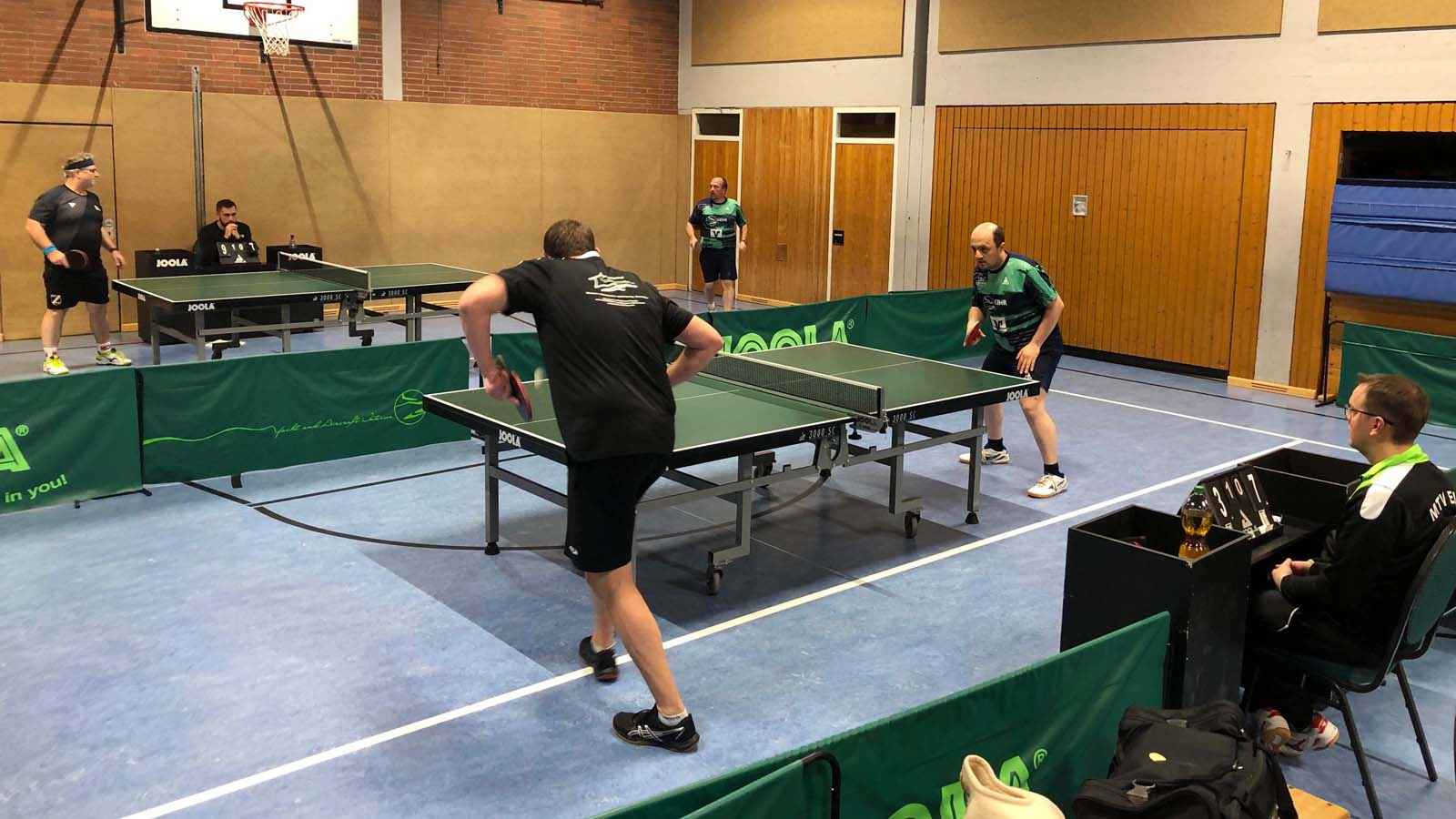 Uns gelang zunächst kein Punkt in den Doppeln. Lediglich Julia und Tiger waren konkurrenzfähig. Im oberen Paarkreuz war dann außerdem für Tiger und mich gegen die erfahrenen Sascha Lieschweski bzw. Dennis Pump nichts zu holen.