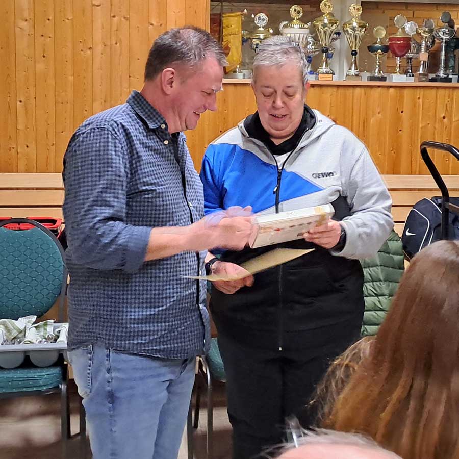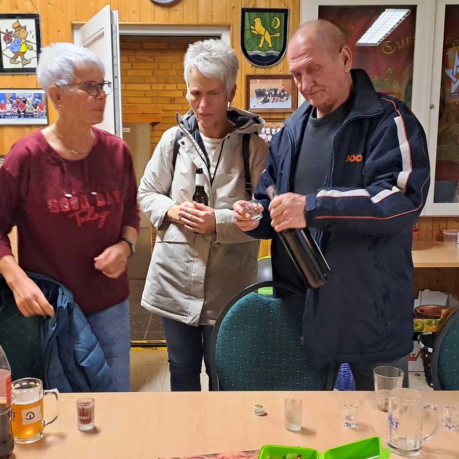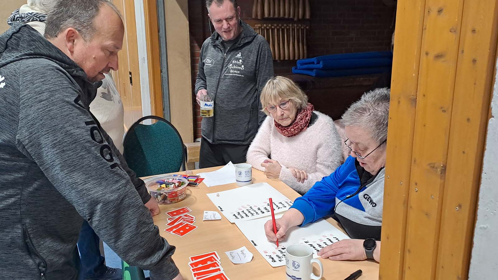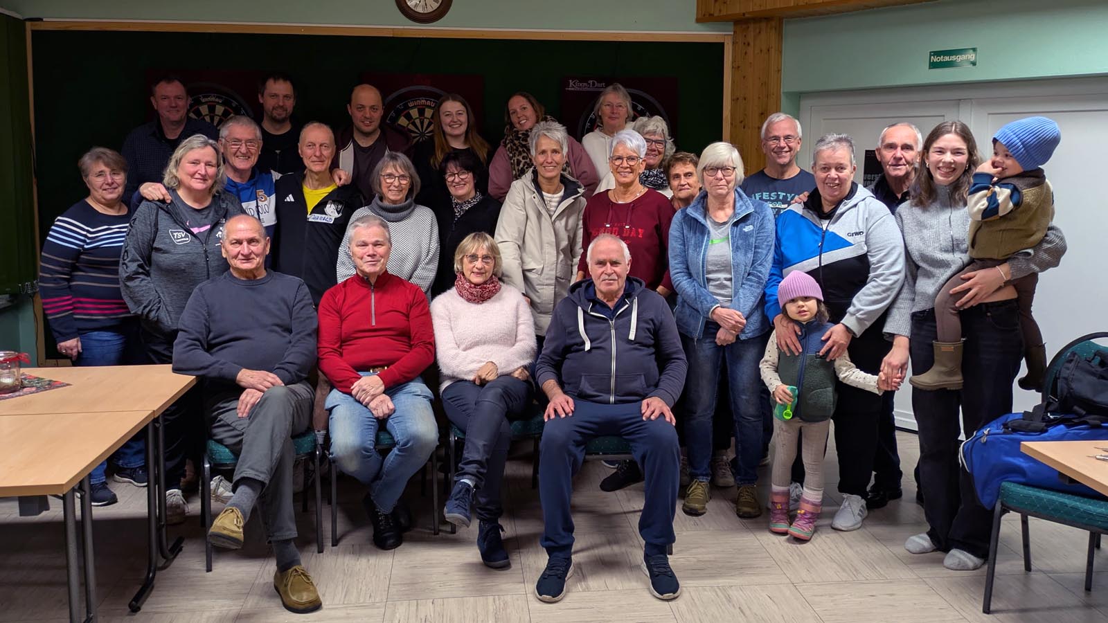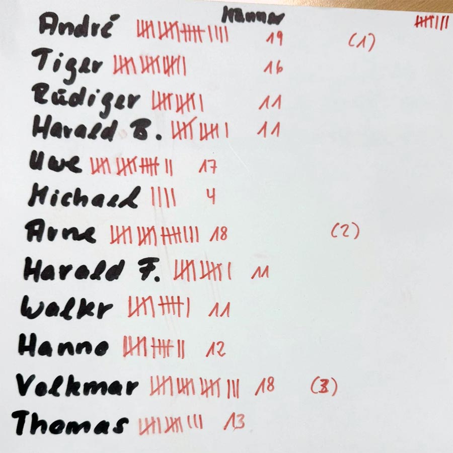 Zwei Gewinnsätze, wobei in jeder Runde per Karte ein neuer Partner/eine neue Partnerin zugelost wurde. Allerdings konnte direkt anschließend im Darten das Ergebnis korrigiert werden, was zumindest Conny und Thomas (und Paula?) erstaunte, weil ich es vorher vergessen hatte, ihnen zu sagen. So kamen wir auf 8 Spielrunden, die Silke (Werner) souverän dokumentierte, bevor die Ergebnisse feststanden. Es trugen sich Gunda (3. Platz), Paula (2. Platz) und Johanna (1. Platz) bei den Damen und Volkmar (3. Platz), Arne (2. Platz) und André (1. Platz) in die Siegerliste ein. Fairerweise muss erwähnt werden, dass Volkmar und Arne die gleiche Punktzahl hatten, aber da laut Urkunde keine zwei 2. Plätze vorgesehen waren, wurde so entschieden und da ist das Geschwistersein eben manchmal auch ein Nachteil.