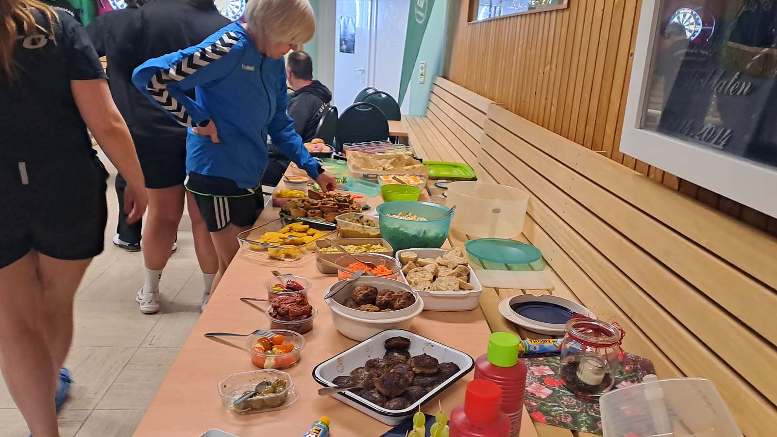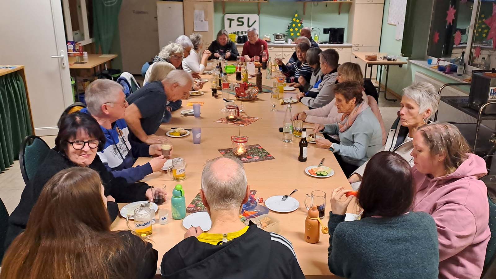 Der anschließende Blick auf das Buffet war eine Augenweide und hätte einem 5-Sterne Essen (oder wie viele Sterne gibt es?) locker standgehalten. Dazu gab es ein 30-Liter-Fass Bier, von Rüdiger nachträglich anlässlich seines 70. Geburtstags gesponsert, was ich völlig vergessen hatte zu erwähnen. Danke nochmal dafür und auch für die vielen leckeren Essensachen. Zum Schluss gab es noch für jede/n einen Glücksbringer, damit sie gesund bleiben und im nächsten Jahr dabei sein können.