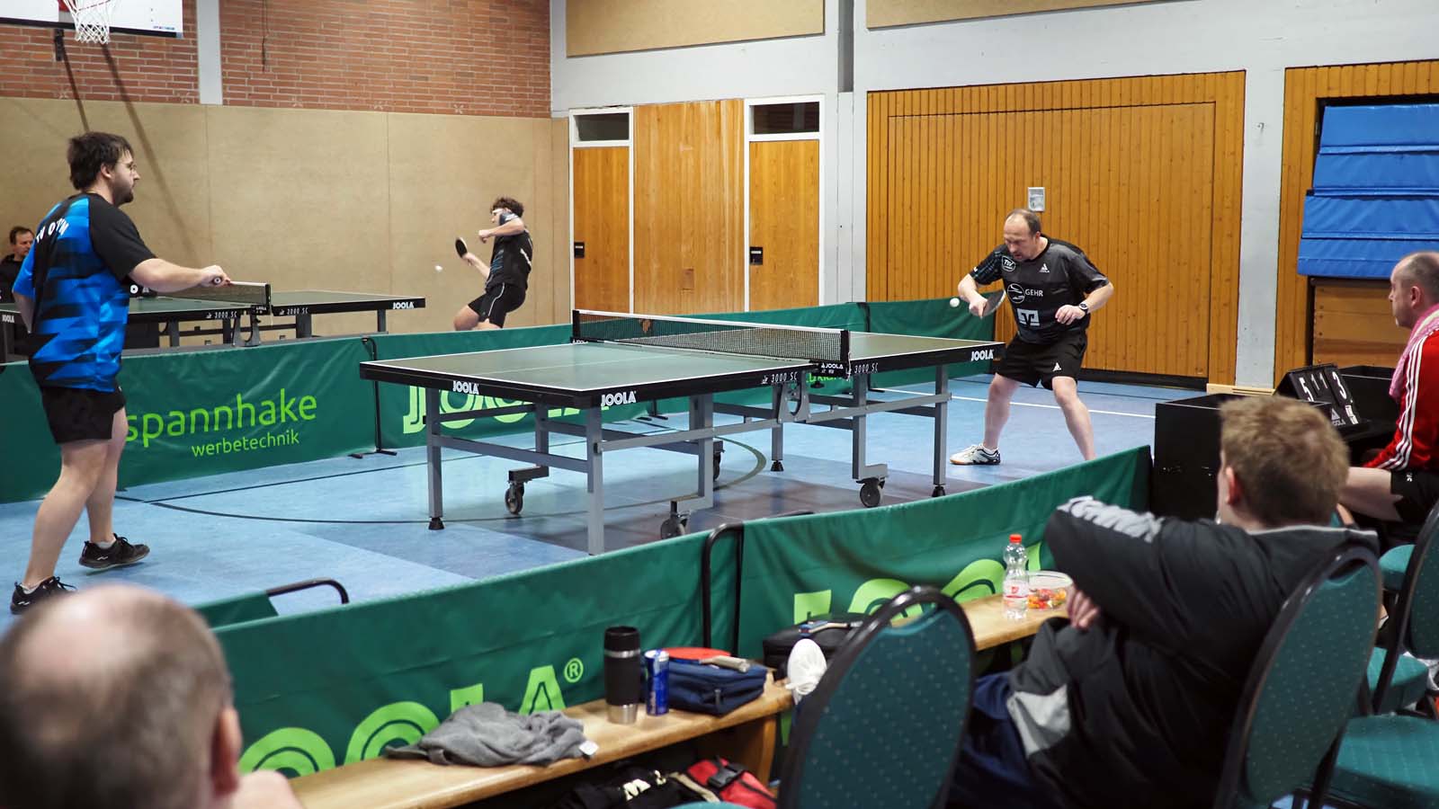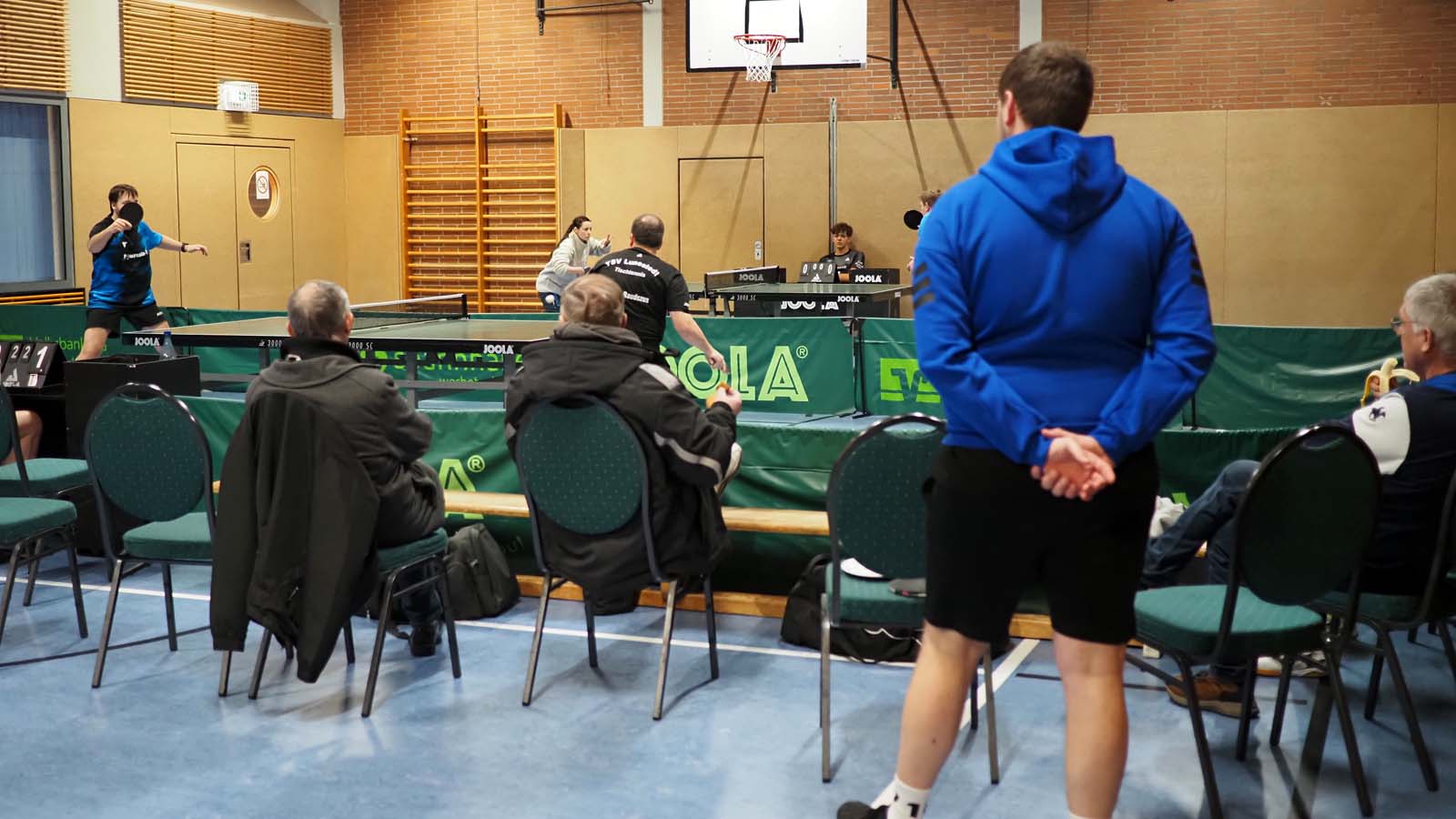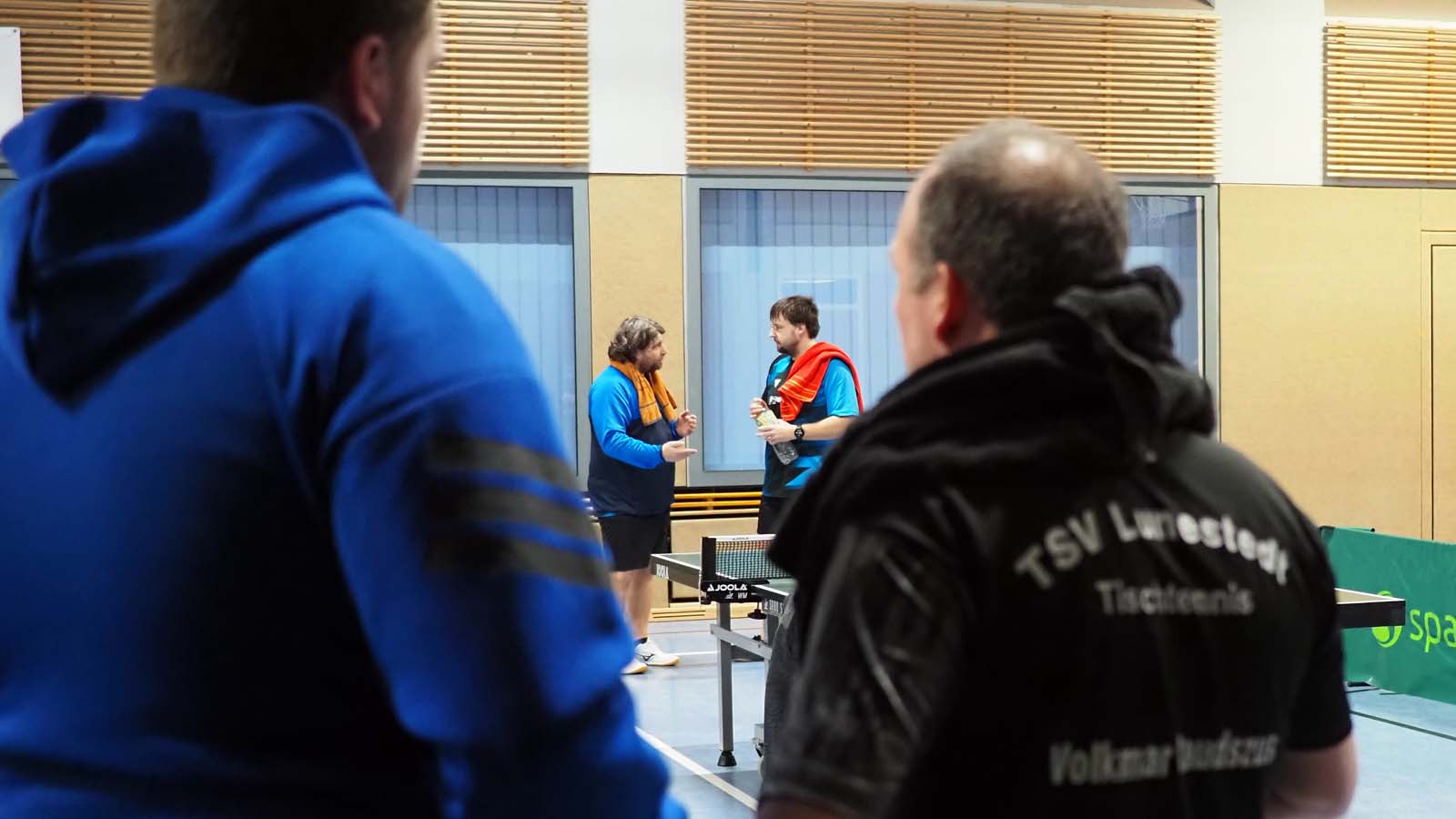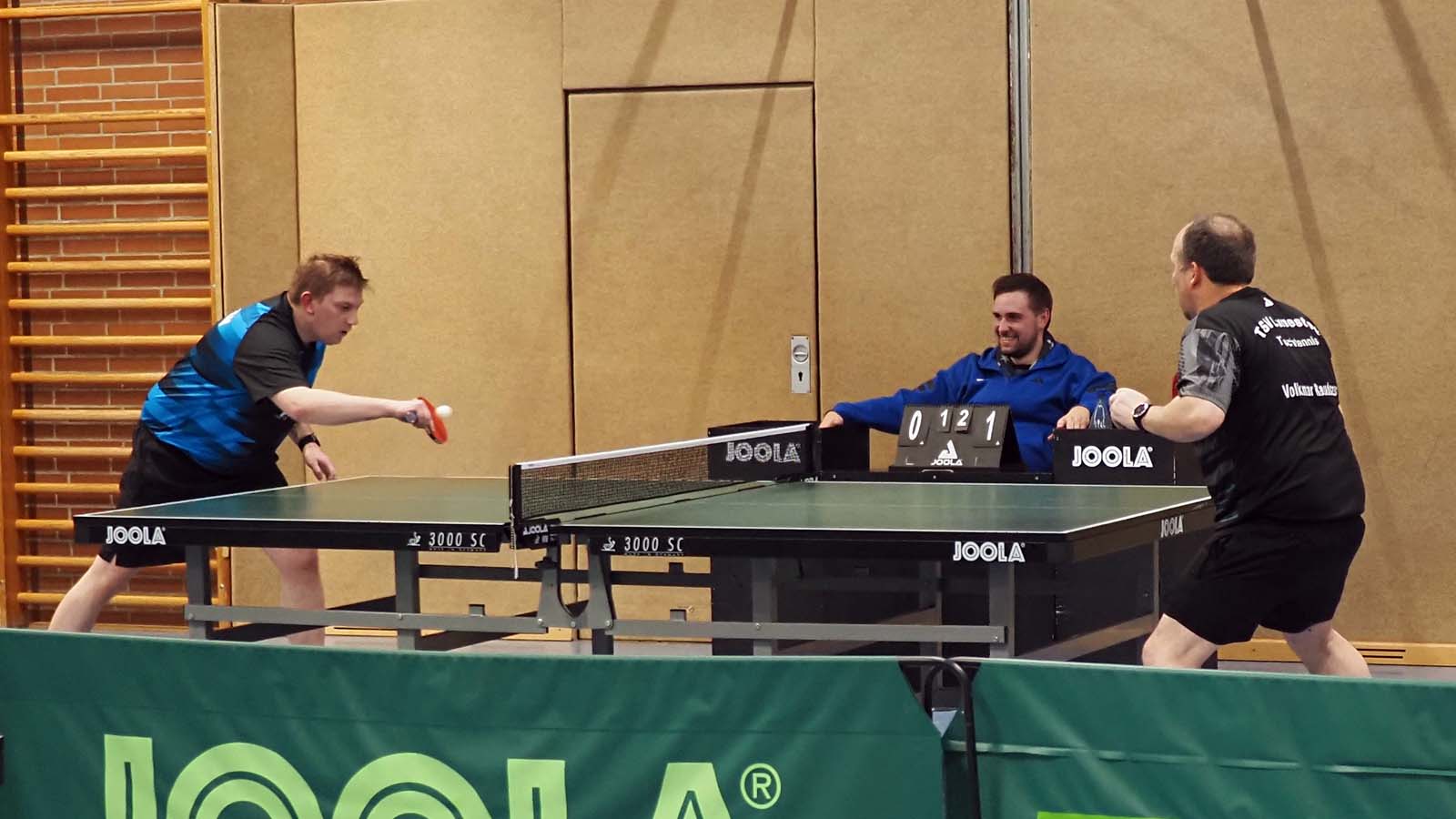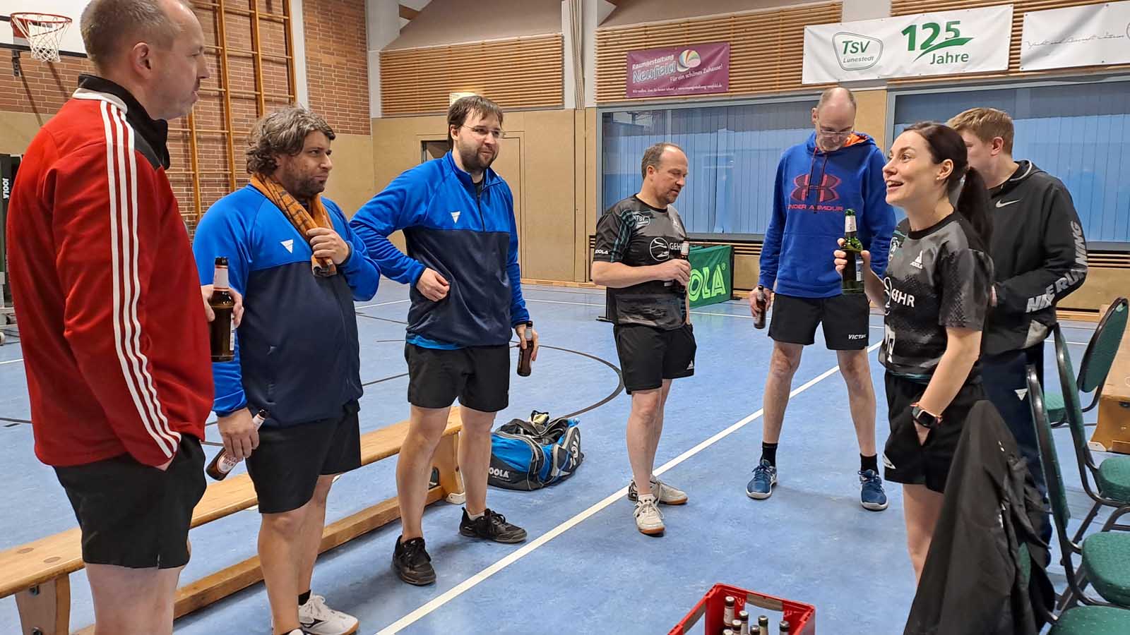Bei drei zeitgleichen Spielen war es kuschelig in der Halle. Angesichts unserer 2:0-Führung nach den ersten beiden Doppeln ließen sich unsere Gäste davon aber scheinbar mehr beirren als wir. Ronald und Thorben gelang dabei das Break, als sie souverän 3:0 gegen das beste Doppel der vorigen BOL-Saison, Franz und Arne, gewannen. Julia und ich unterlagen in fünf Sätzen (auch wenn der Spielbericht das anders sieht) gegen Peter und Thomas, die ihre Bilanz damit auf 10:0 erhöhten.