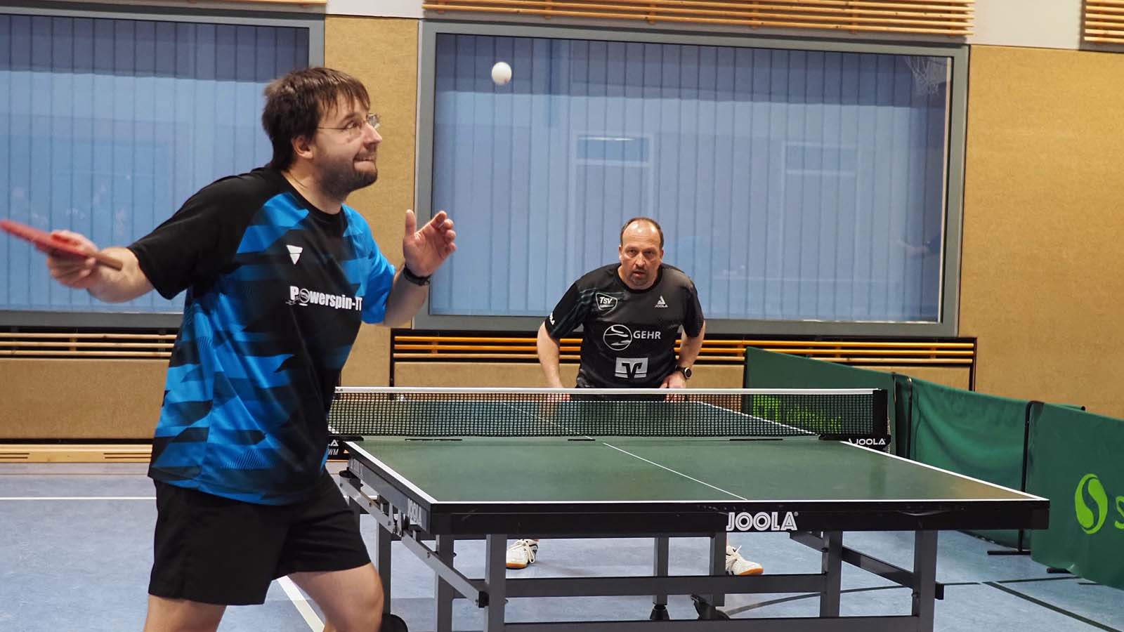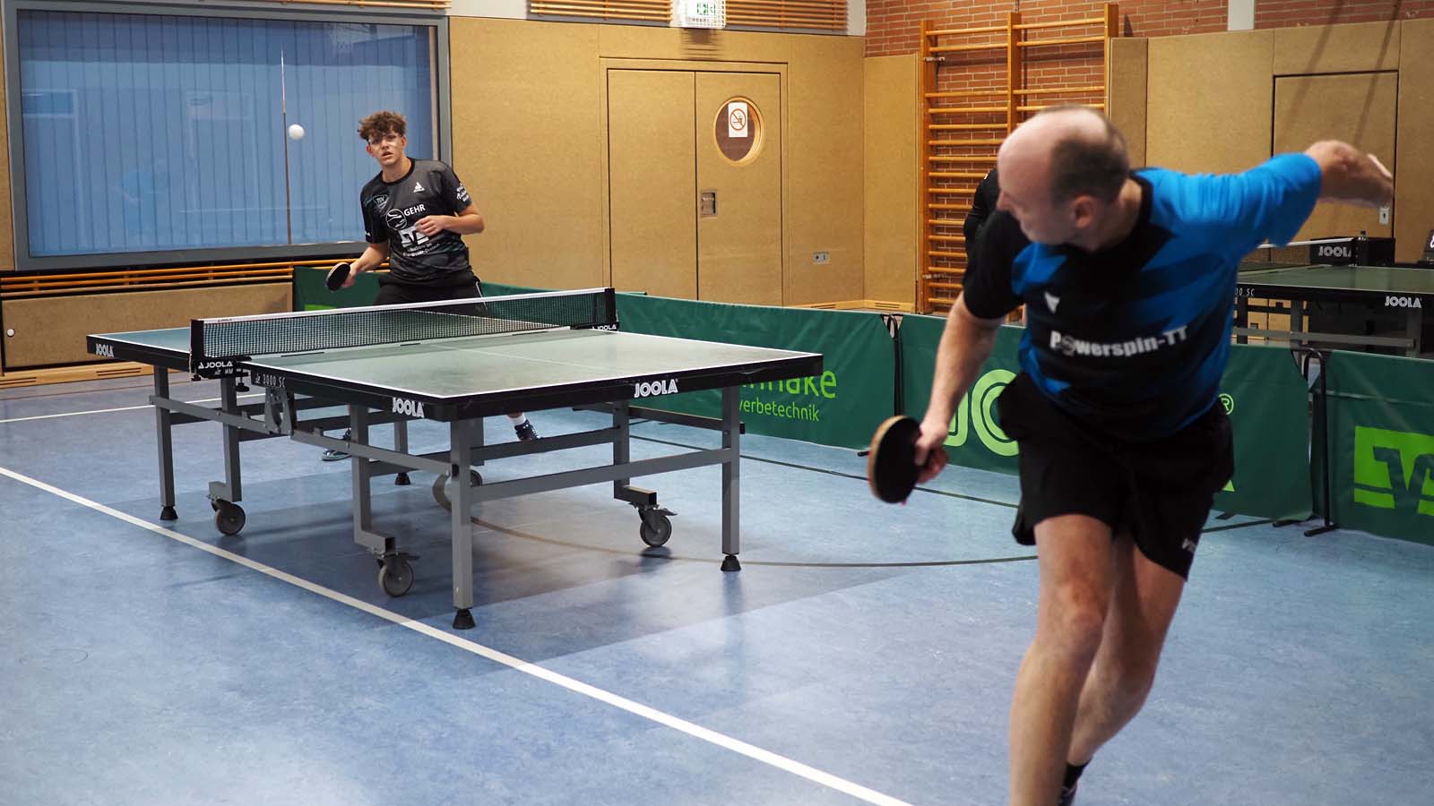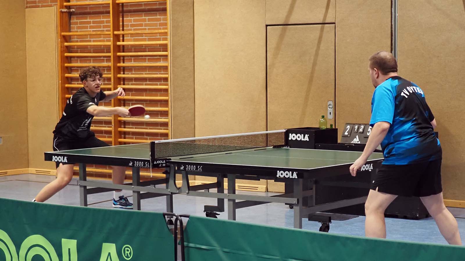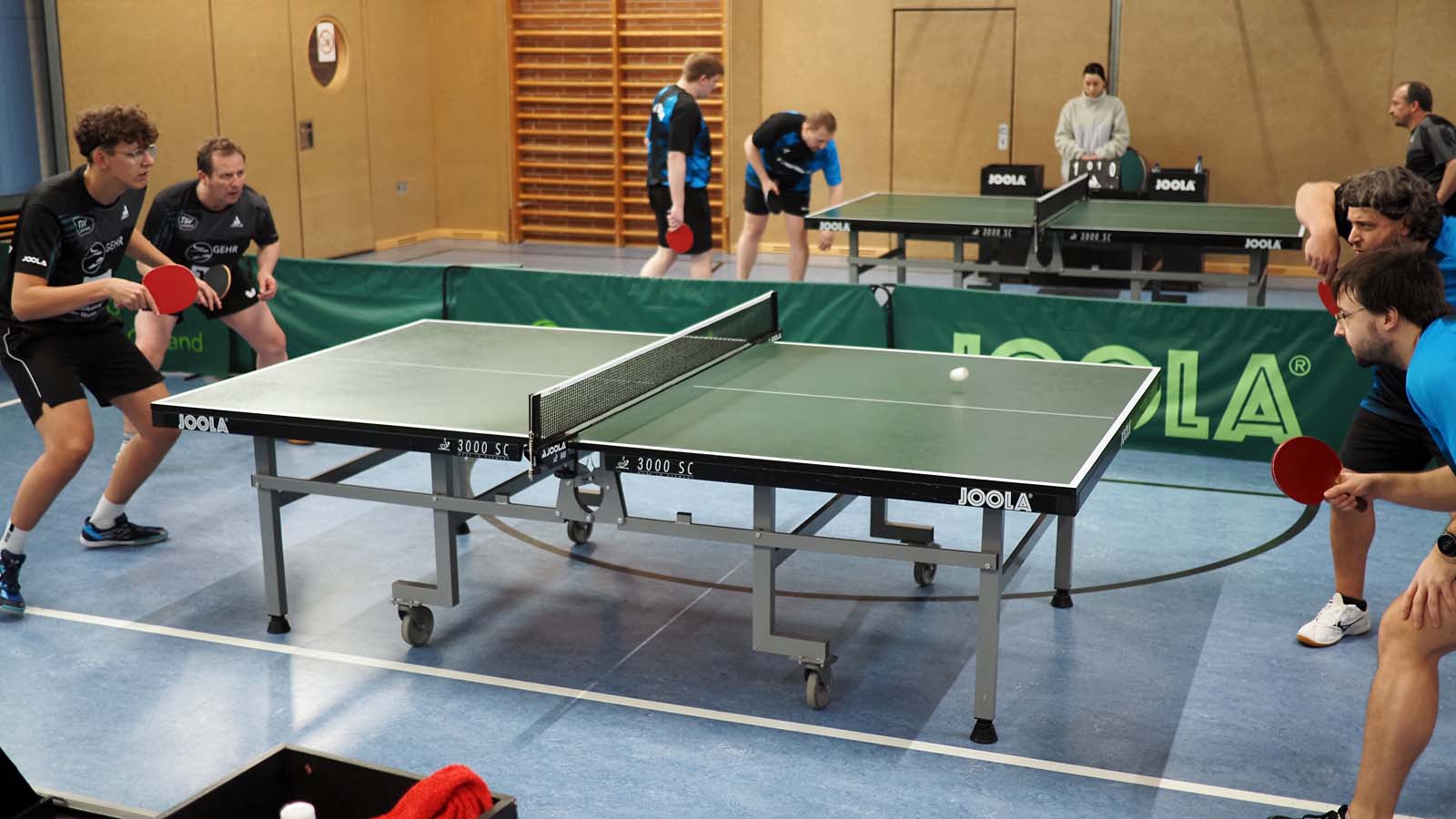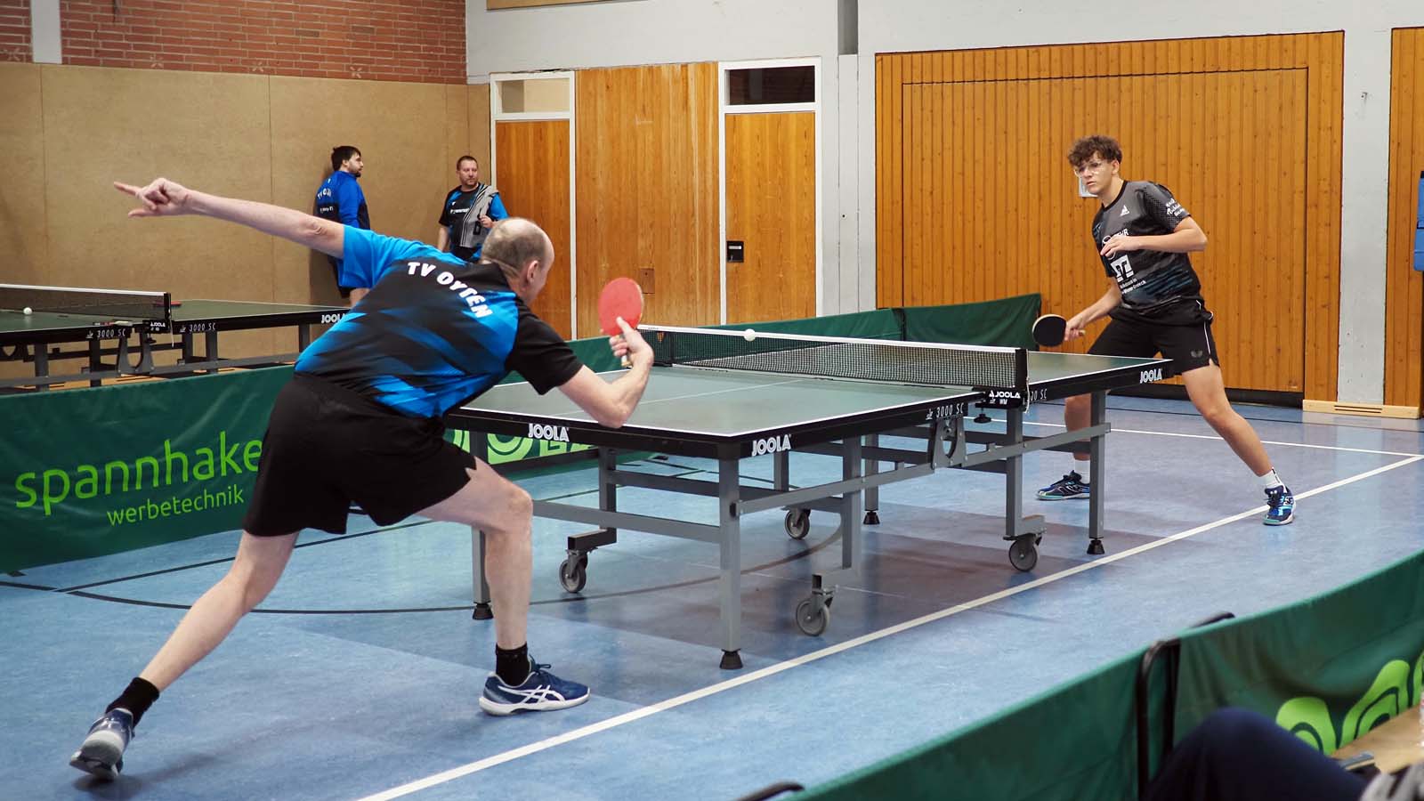 Bei drei zeitgleichen Spielen war es kuschelig in der Halle. Angesichts unserer 2:0-Führung nach den ersten beiden Doppeln ließen sich unsere Gäste davon aber scheinbar mehr beirren als wir. Ronald und Thorben gelang dabei das Break, als sie souverän 3:0 gegen das beste Doppel der vorigen BOL-Saison, Franz und Arne, gewannen. Julia und ich unterlagen in fünf Sätzen (auch wenn der Spielbericht das anders sieht) gegen Peter und Thomas, die ihre Bilanz damit auf 10:0 erhöhten.