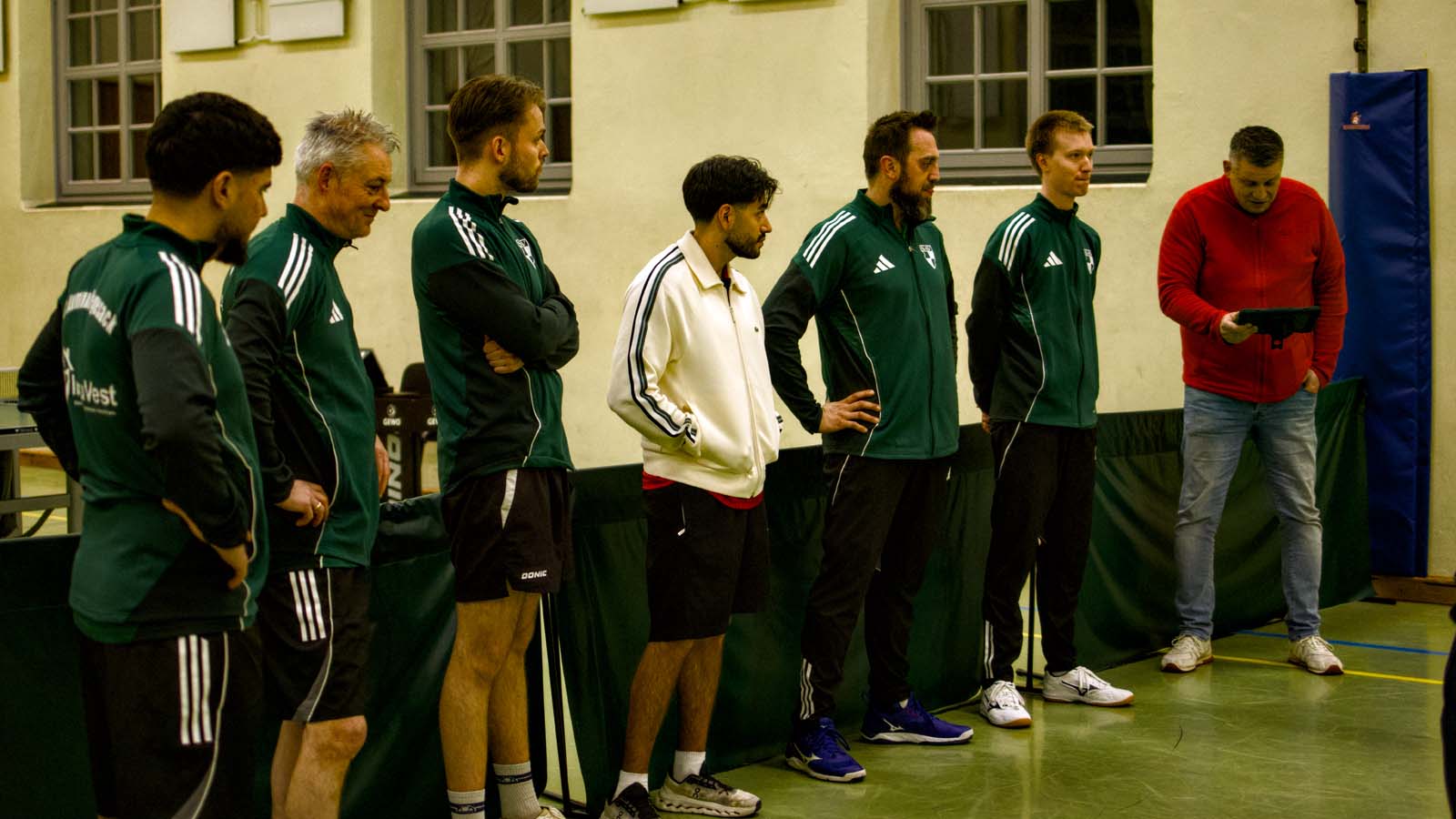 Die Gastgeber nahmen uns offenbar zumindest so ernst, dass sie keine Kosten und Mühen gescheut haben zur Optimierung ihres Kaders noch Spieler einzufliegen, so dass beide Seiten vollständiger als beim 3:9 im Hinspiel antraten. In kalter Halle folgte dann das erwartete enge Spiel.