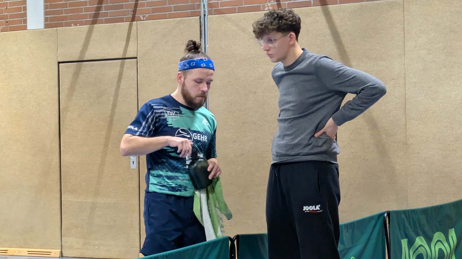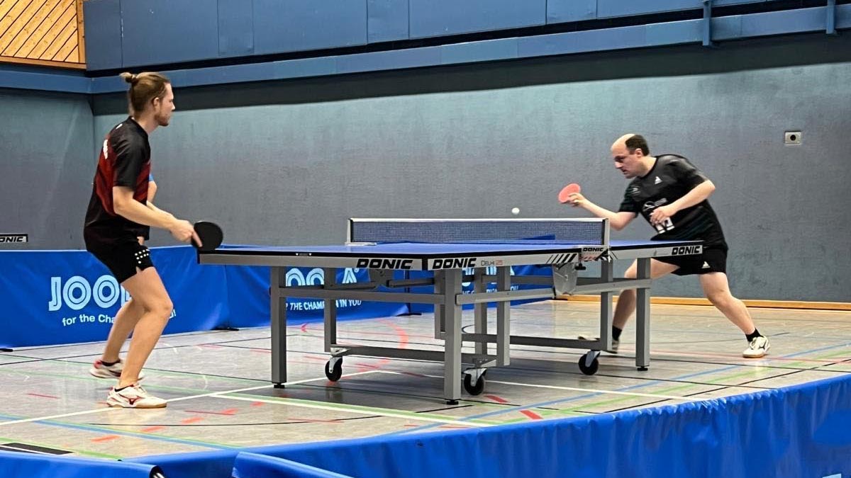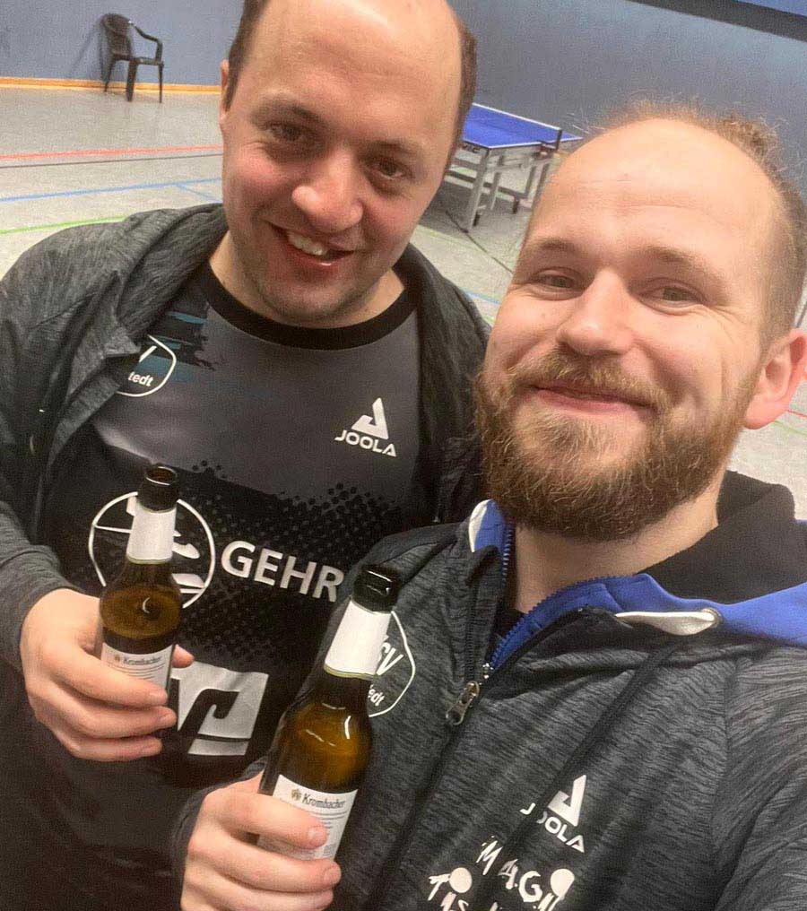 Am Nachbartisch schien dies in Uwe und Matze die entscheidenden Hebel umgelegt zu haben, um beim Stand von 0:1 auf ihr bestes Tischtennis zurückgreifen zu können. Mit cleveren Variationen, Kalkül und dem allseits bekannten Schmunzeln auf den Lippen, zogen sie Spiewack und Burmester langsam, aber sicher den Zahn und sicherten uns den dringend benötigten Siegpunkt zum überlebenswichtigen 9:7.