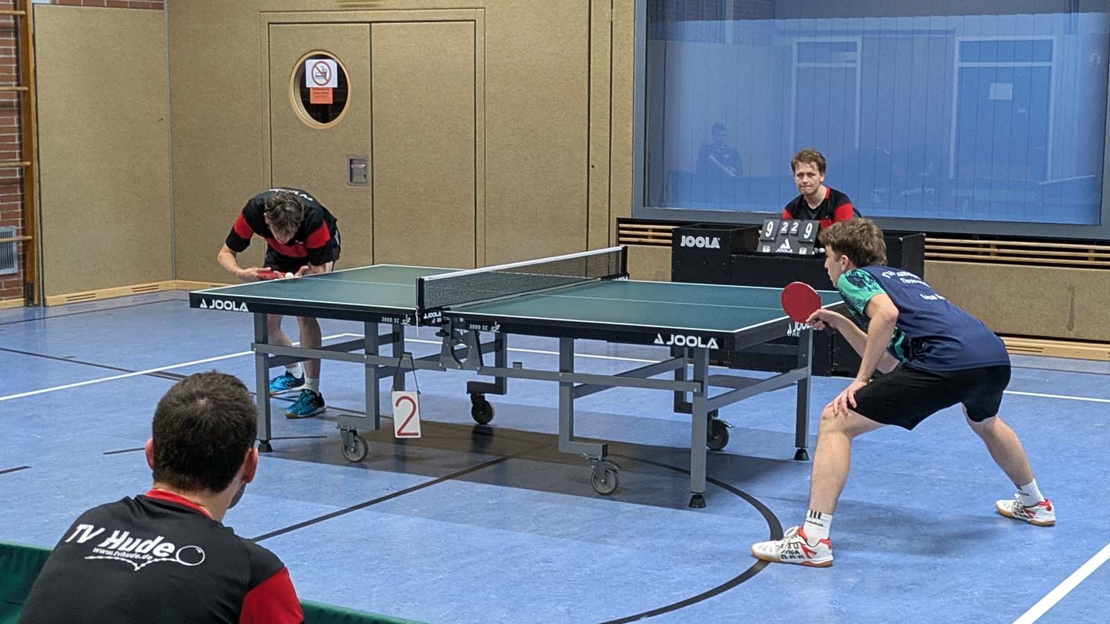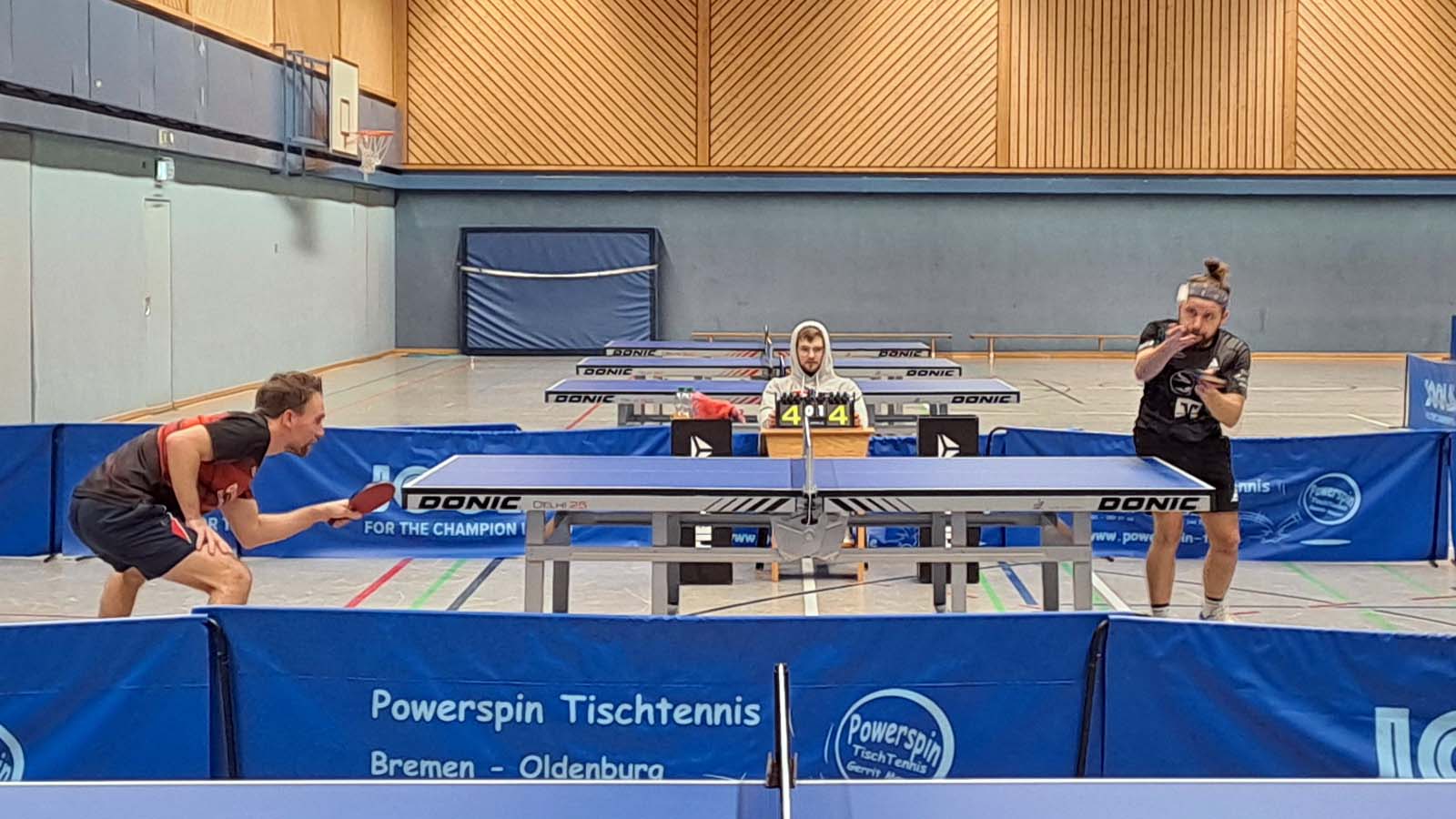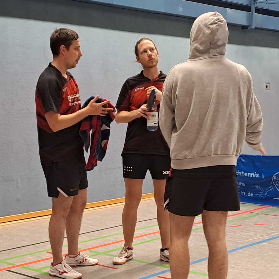 In den Doppeln kamen Arne und ich nicht über insgesamt 15 Punkte gegen Burmester/Spiewack hinaus (0:3). Dankenswerterweise nahm mir Arne in seiner bekannt kollegialen Art den Druck beim Aufschlag, indem er im zweiten Durchgang keinen einzigen der seinen auf die gegnerische Tischhälfte beförderte. Uwe und Matze hingegen schienen nach der Niederlage im Abschlussdoppel des Vortags etwas gutzumachen zu wollen. Mit Erfolg, so gewannen sie in drei deutlichen Sätzen gegen Raudszus/Siemer (3:0). Hüse und Thorben sorgten indes für die 2:1‑Führung, indem sie gegen Mogalle/Kück ein 1:2 noch in einen Sieg ummünzen konnten (3:2).