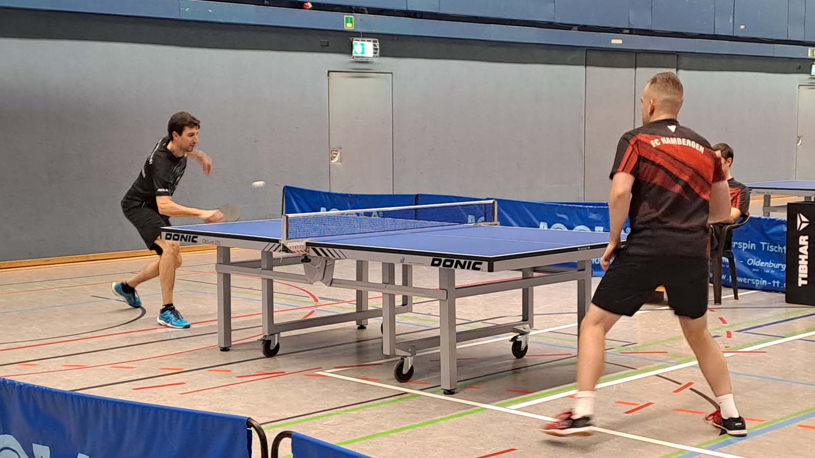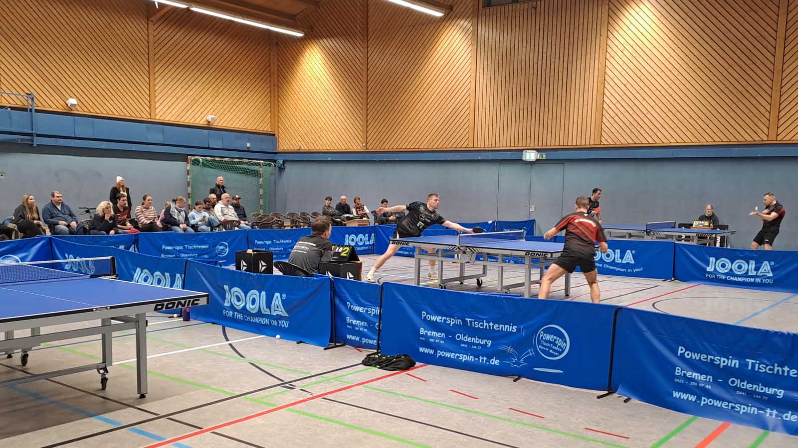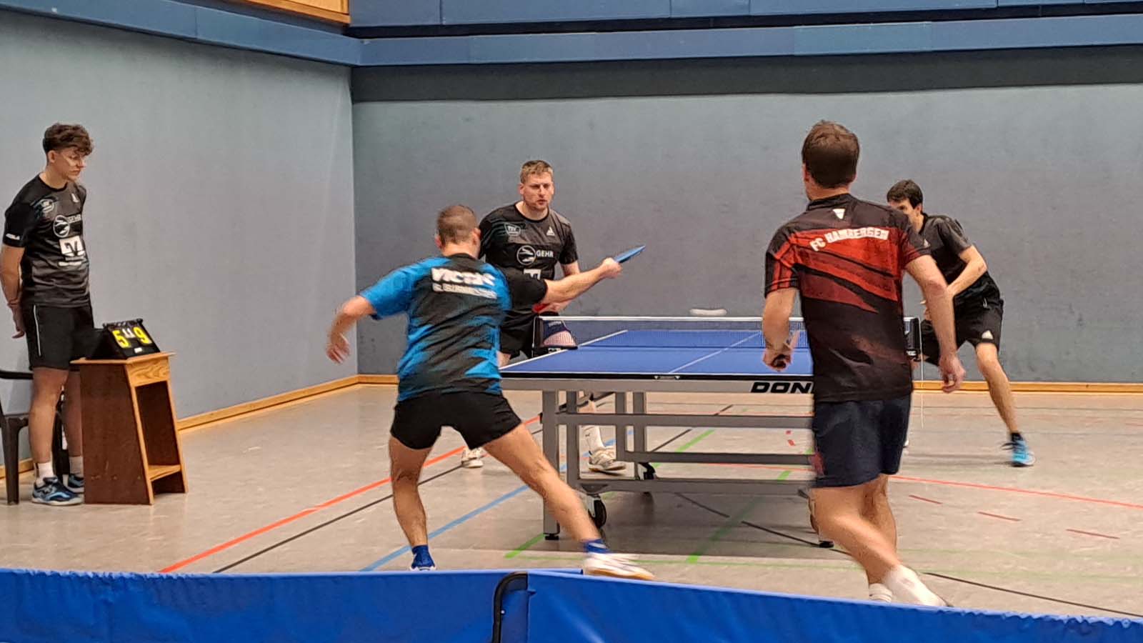 In den Doppeln kamen Arne und ich nicht über insgesamt 15 Punkte gegen Burmester/Spiewack hinaus (0:3). Dankenswerterweise nahm mir Arne in seiner bekannt kollegialen Art den Druck beim Aufschlag, indem er im zweiten Durchgang keinen einzigen der seinen auf die gegnerische Tischhälfte beförderte. Uwe und Matze hingegen schienen nach der Niederlage im Abschlussdoppel des Vortags etwas gutzumachen zu wollen. Mit Erfolg, so gewannen sie in drei deutlichen Sätzen gegen Raudszus/Siemer (3:0). Hüse und Thorben sorgten indes für die 2:1‑Führung, indem sie gegen Mogalle/Kück ein 1:2 noch in einen Sieg ummünzen konnten (3:2).