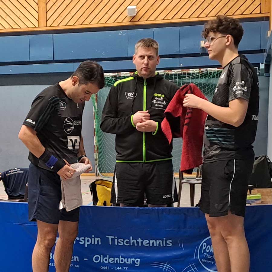 Anschließend kam Uwe gegen Spiewack, ebenso wie ich vor ihm, nicht über ein 1:3 hinaus, während ich gegen Burmester zum ersten Mal in dieser Saison so richtig unter die Räder kam und gefühlt nicht einen einzigen Rückschlag auf den Tisch spielte (0:3). Als Matze dann noch gegen Raudszus so absolut gar nicht ins Spiel zu finden schien und durch seine Niederlage (1:3) auf 5:7 stellte, standen wir bereits mit dem Rücken zur Wand. Hüse und Thorben stellten dann jedoch mit ihren 3:0‑Erfolgen über Siemer und Mogalle auf 7:7 und mischten somit die Karten neu, die Arne in seine absolute Lieblingssituation versetzen sollten: das alles entscheidende Einzel (Hinweis: Ironie). Beim Stand von 0:2 gegen Kück, kam nur die Frage: „Wie ist der Gesamtstand?“ Antwort: „7:7“, Arne: „OK“. In der Folge wuchs Arne über sich hinaus, zog die nächsten drei Sätze auf beeindruckende Art und Weise an Land und belohnte sich selbst mit seinem ersten Einzelerfolg in der Verbandsliga. Wie ein bekannter Tischtennisspieler aus Bayern in Diensten Oldenburgs sagen würde: „Bravo!“